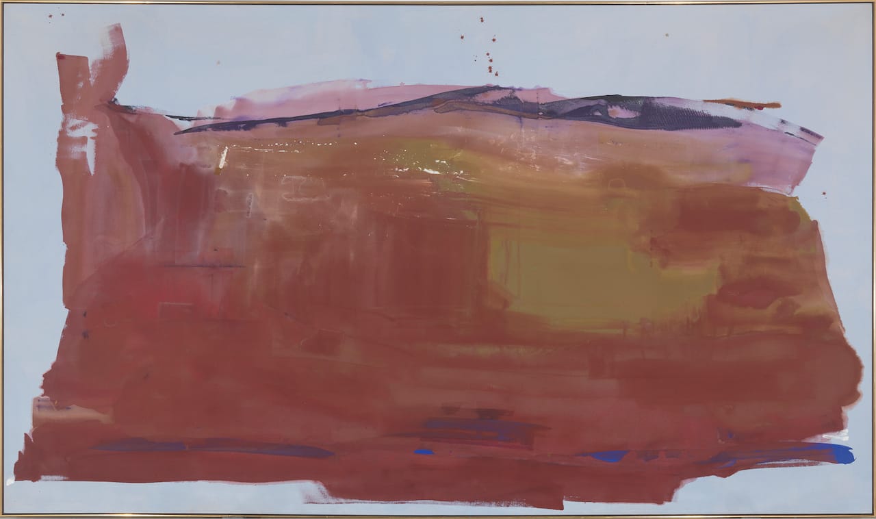 Both the Rose Museum exhibition and the associated book present Helen Frankenthaler as a pivotal figure. Yet her role here is very different from her portrayal as a conduit (or “bridge” according to Morris Louis) in the histories of Abstract Expressionism starring the big boy painters, and in Clement Greenberg’s formalism. In those versions of the story, Frankenthaler was the connective link between Jackson Pollock and later Color Field painting, having embarked upon her stain technique after seeing Pollock’s use of unprimed canvas (an introduction engineered by Greenberg), and in turn inspiring the large pours by Louis that Greenberg latched onto as a continuation of the medium’s formal concerns.