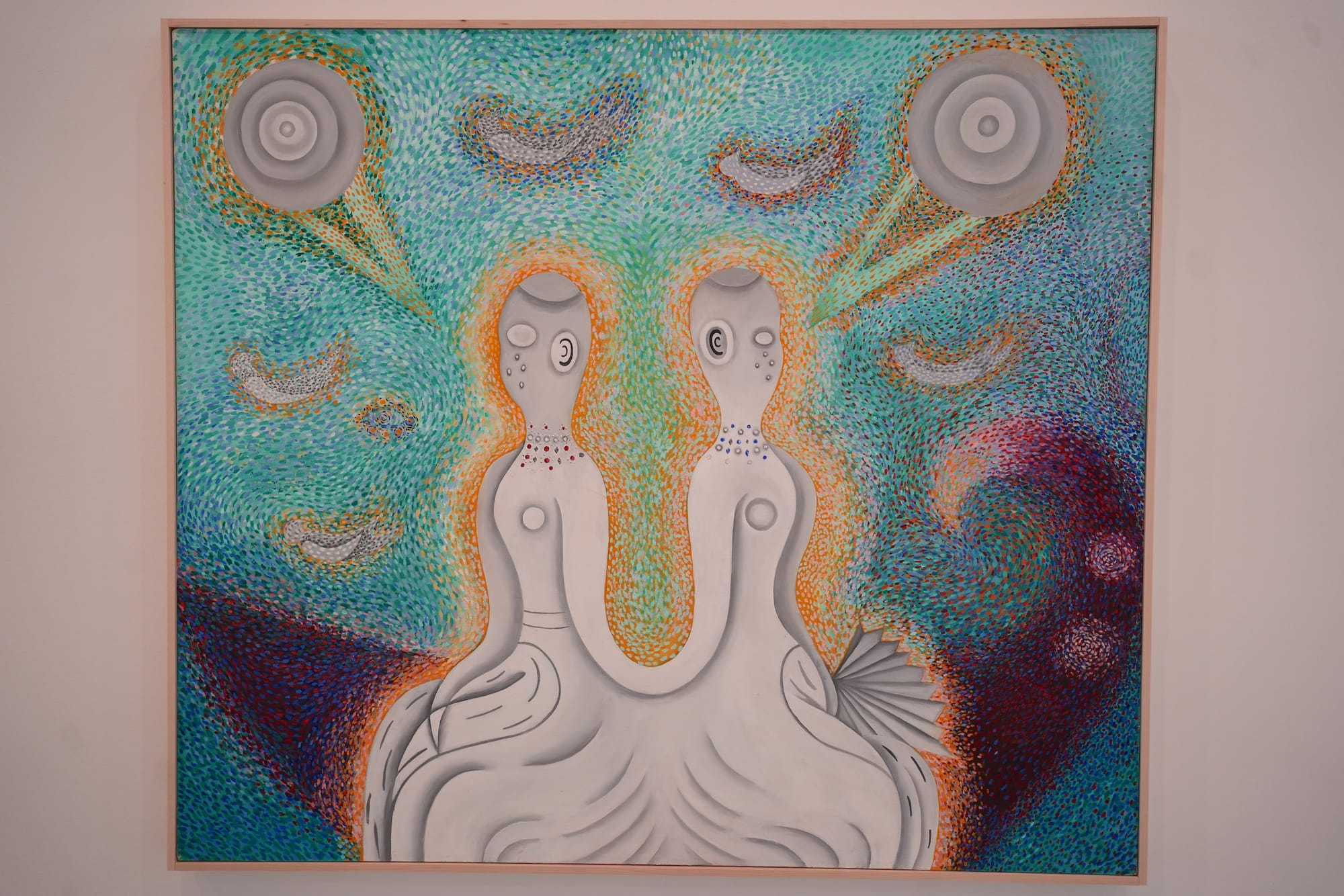 Along with these enigmatic paintings, in which the repetition of images is essential to the composition, Rocca created others that don’t fit into this mold, such as “Lamp Poem” (c. 1969), whose edge is made of pleated fabric. If she had repeated this in several pieces, she would have diminished the power of this work. On the shade of a blue lamp at the center, Rocca has depicted a house with smoke coming out of its chimney. Lines extend out of both the house and the lampshade, denoting light.