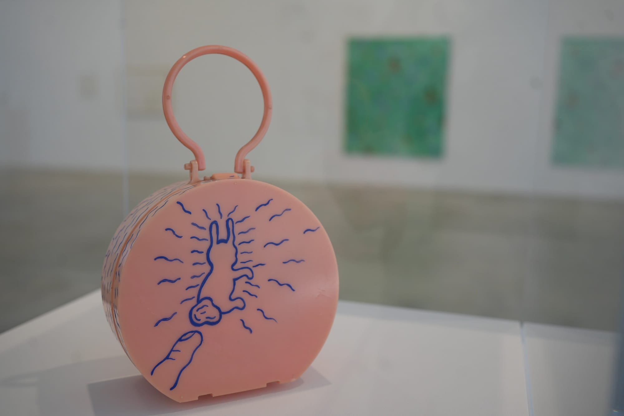 The 20 paintings, drawings, and objects in the exhibition Suellen Rocca: Good Things and Bad Things at Matthew Marks Gallery span 1964 to 2014, nearly her entire career (she died in 2020), and range in size from more than six feet tall and five feet wide, to paintings on small leatherette and plastic purses. By 1964, Rocca had developed her foundational visual language, which can be described as a kind of “picture writing,” in which a simplified graphic image of a narrow bed is used to convey some kind of meaning. The repeated placement of a hand-painted figure with other figures establishes a pictographic field, inviting the viewer to read into it. Deciphering Rocca’s artworks is part of the pleasure of encountering them.