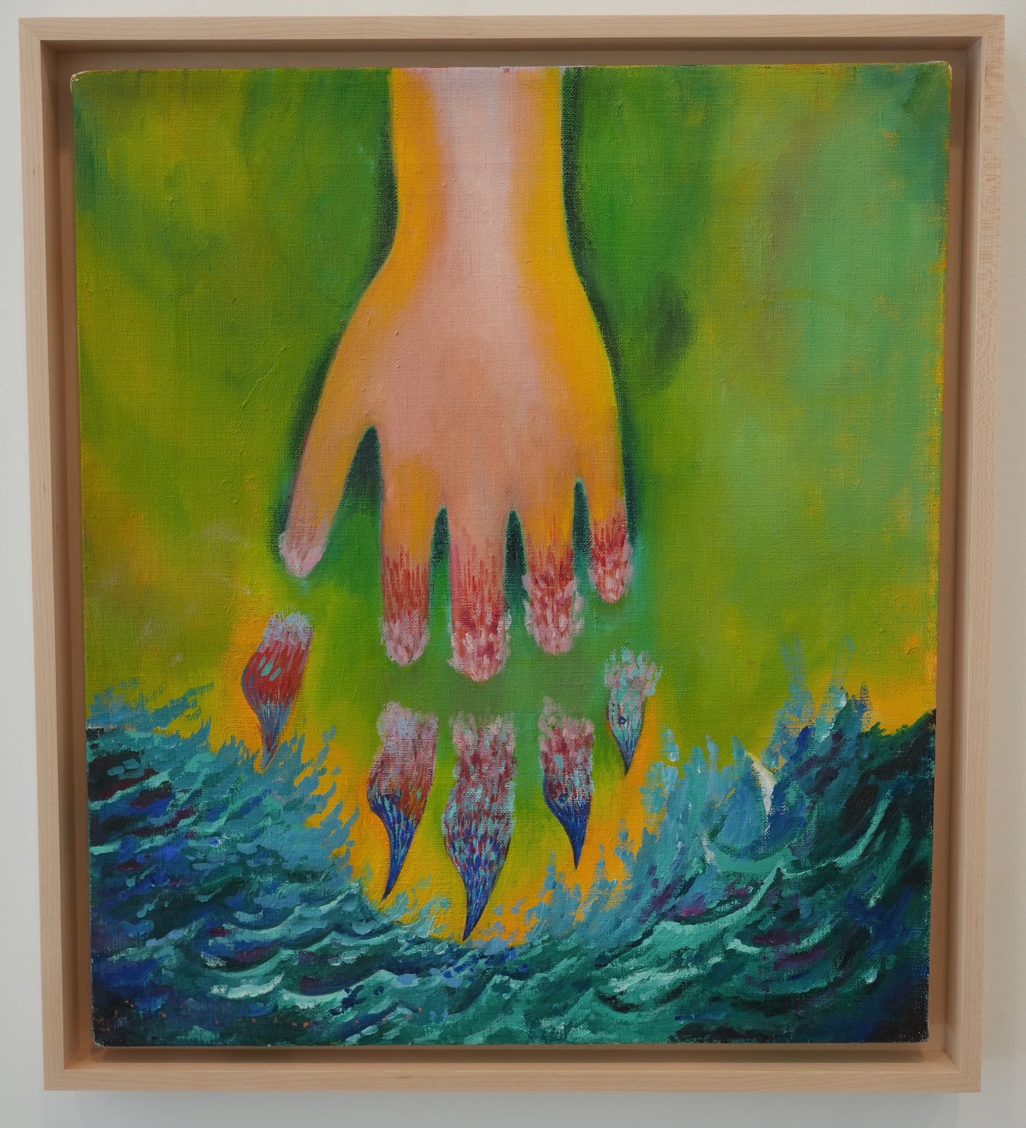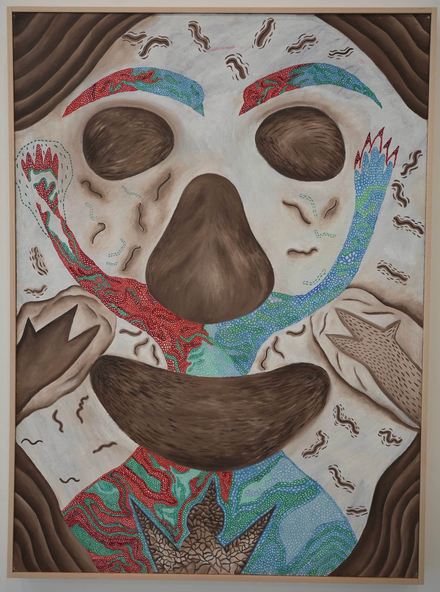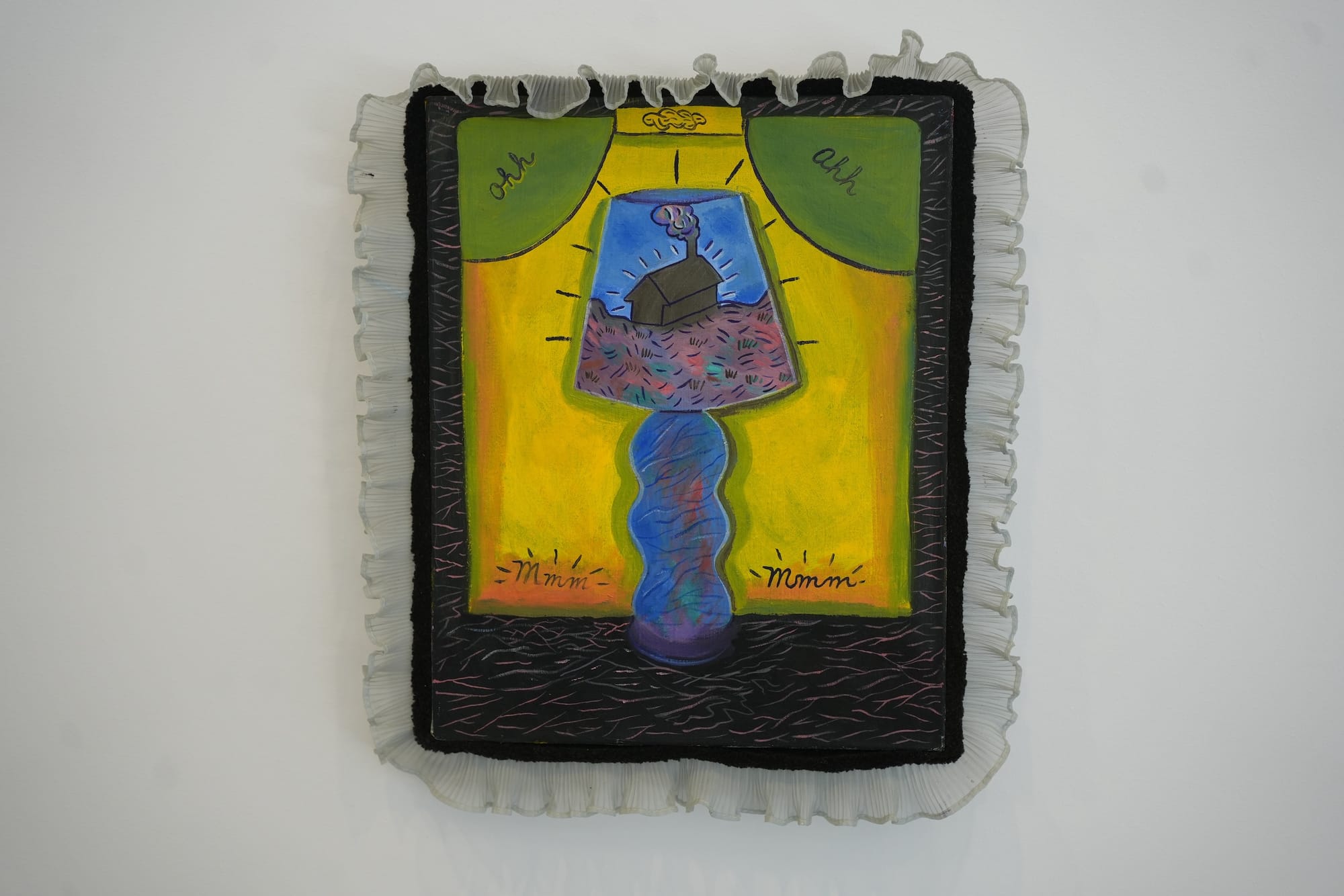 In each corner of the painting, Rocca has written out “ohh,” “ahh,” or “mmm.” What do these pause fillers mean? What do the black lines radiating from “mmm,” and matching those of the house and lamp, signify? What appears at first to be a painting of a lamp becomes strange and incongruous the longer we look at it. Is it about collective aspirations for domesticity and comfort in the United States?