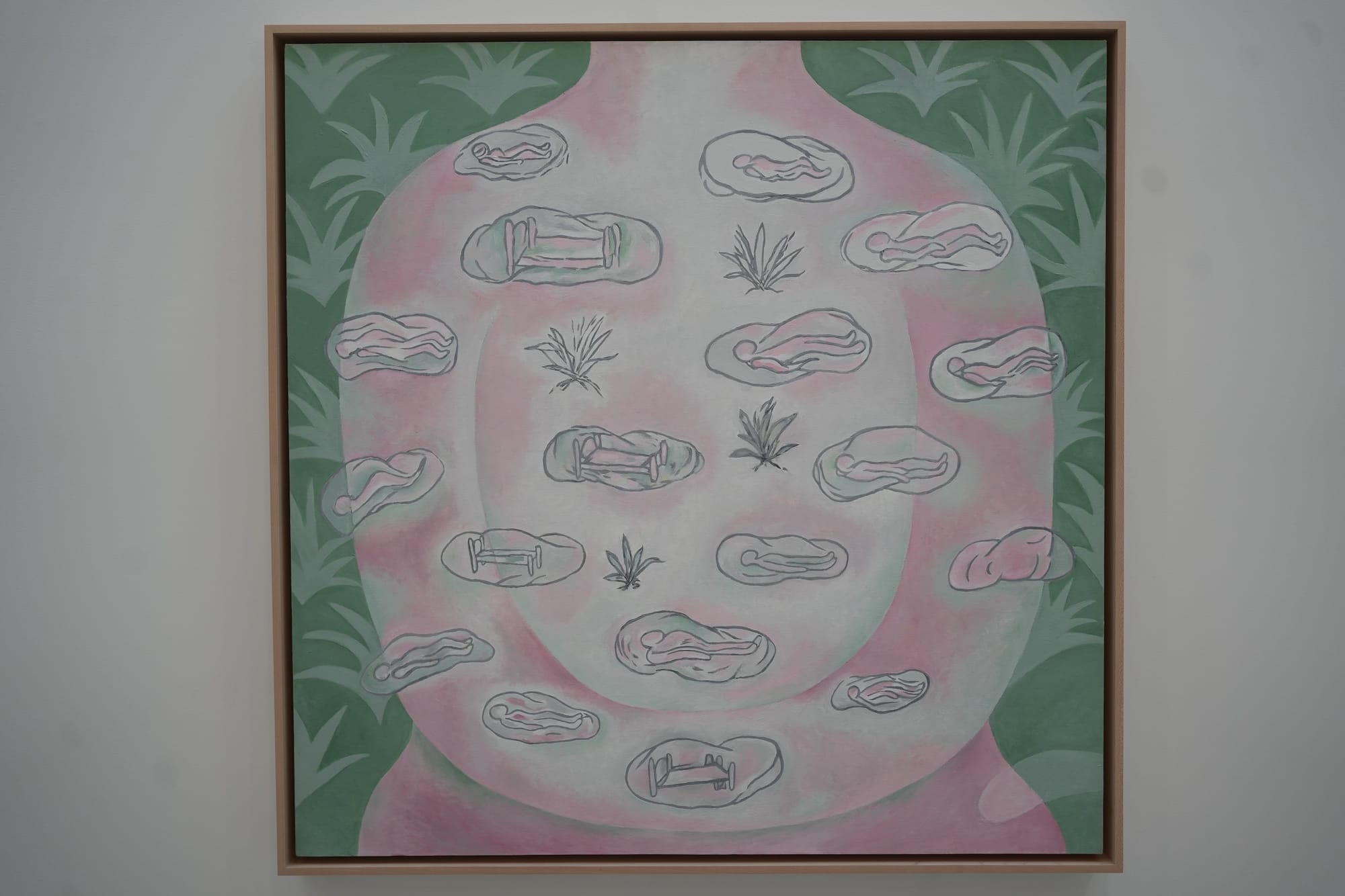 Among Rocca’s primary visual sources are mid-century ads — those reflections and solutions for the nation’s middle-class, conformist desires: get married, buy a diamond ring, raise a family. When Rocca finally homed in on that subject, she added surprising elements to her compositions, such as a palm tree, a person asleep inside a bubble, at once protected and isolated, and two open hands reaching through slits, as if they are inside a headless human body, the latter being one of the most unsettling of her linear pictures.