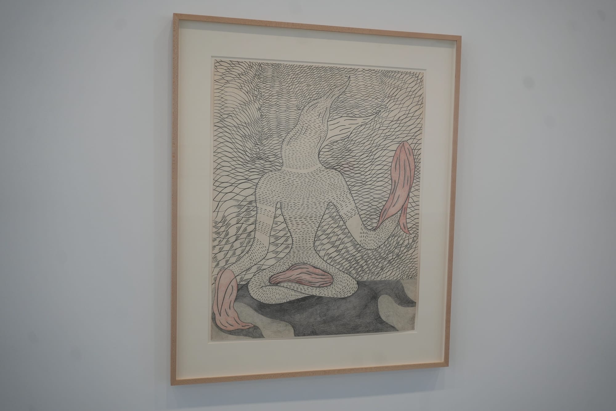 In the mostly black and white drawing “Hidden Danger Lady” (1984–2012), Rocca portrays a creature sitting cross-legged, with space made by overlapping legs and oversized pink hands, the only color in the work. The pink differentiates the space established by the figure’s legs from the black and white ground, complicating the reading of this drawing.