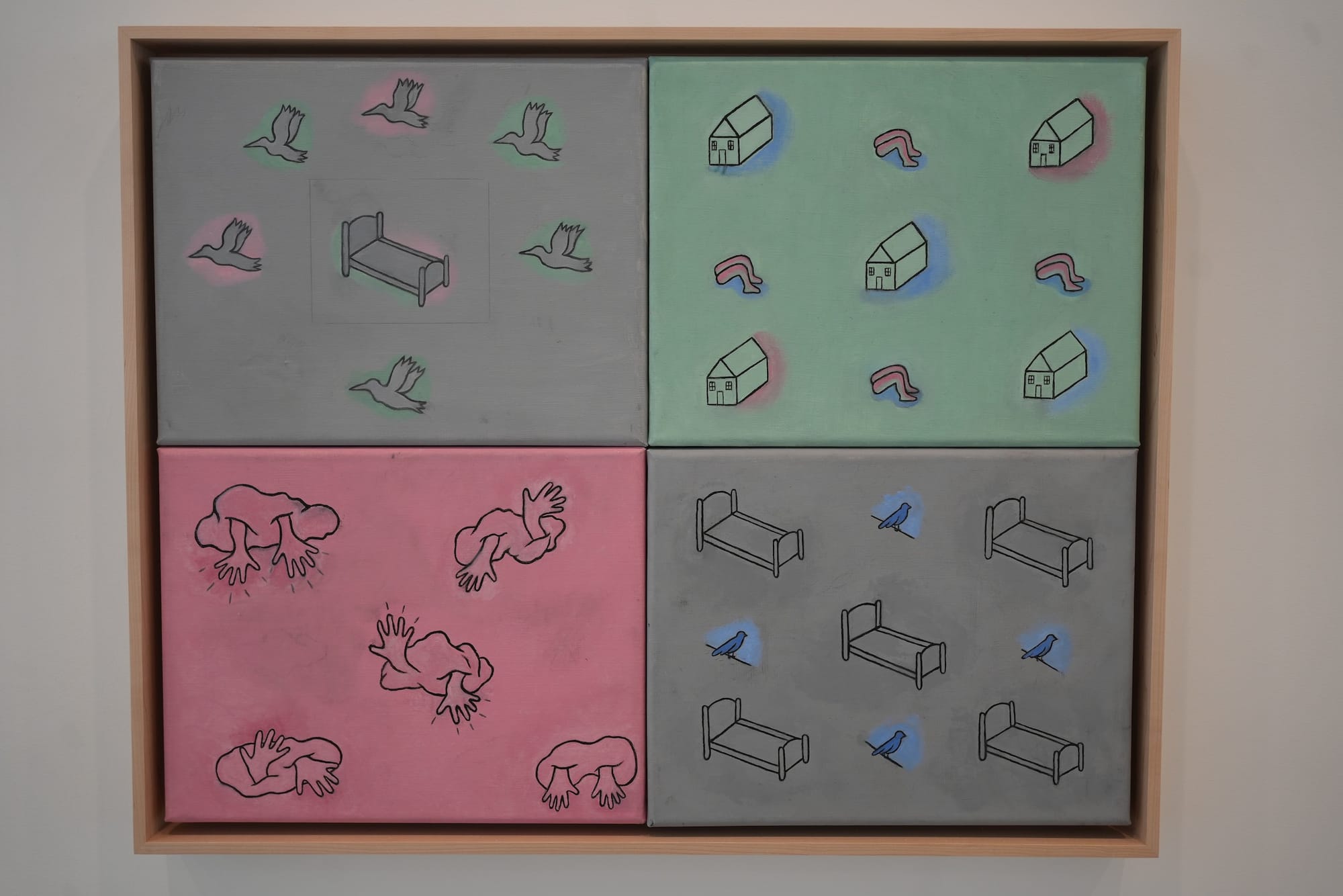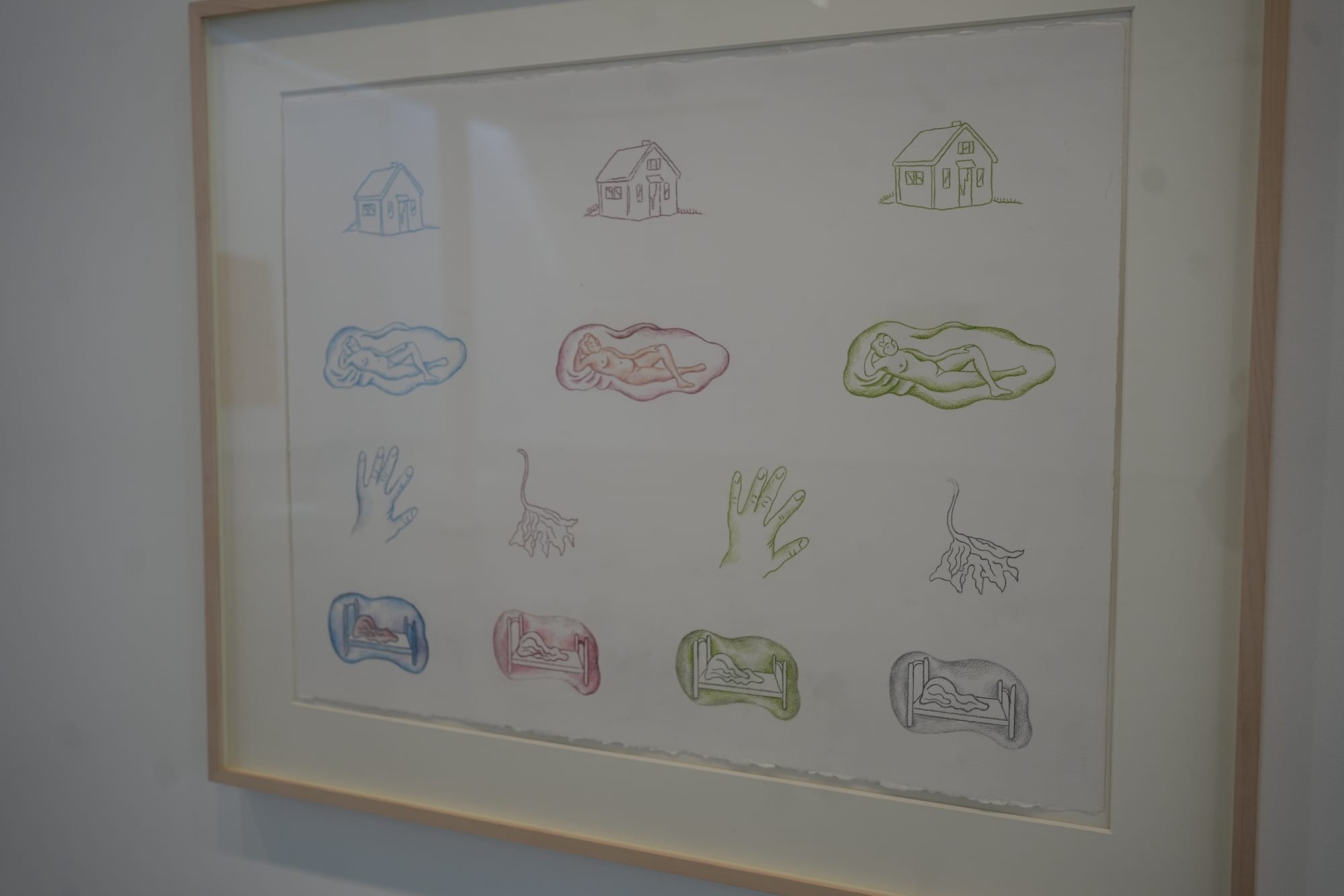 "Untitled” (2020), which features this image in one of its four abutted panels, pushes us to a more ominous reading of seemingly benign iconography — an empty bed, birds perched or in flight, a pair of legs, and a house — transporting us into an area of speculation. An untitled watercolor and graphite work (also 2020) composed of four rows of repeated items similarly unsettles familiar imagery. The top three rows show a house, a nude woman on a large rock, and a hand alternating with a leaf. For the bottom row, Rocca renders a body melting on a bed.