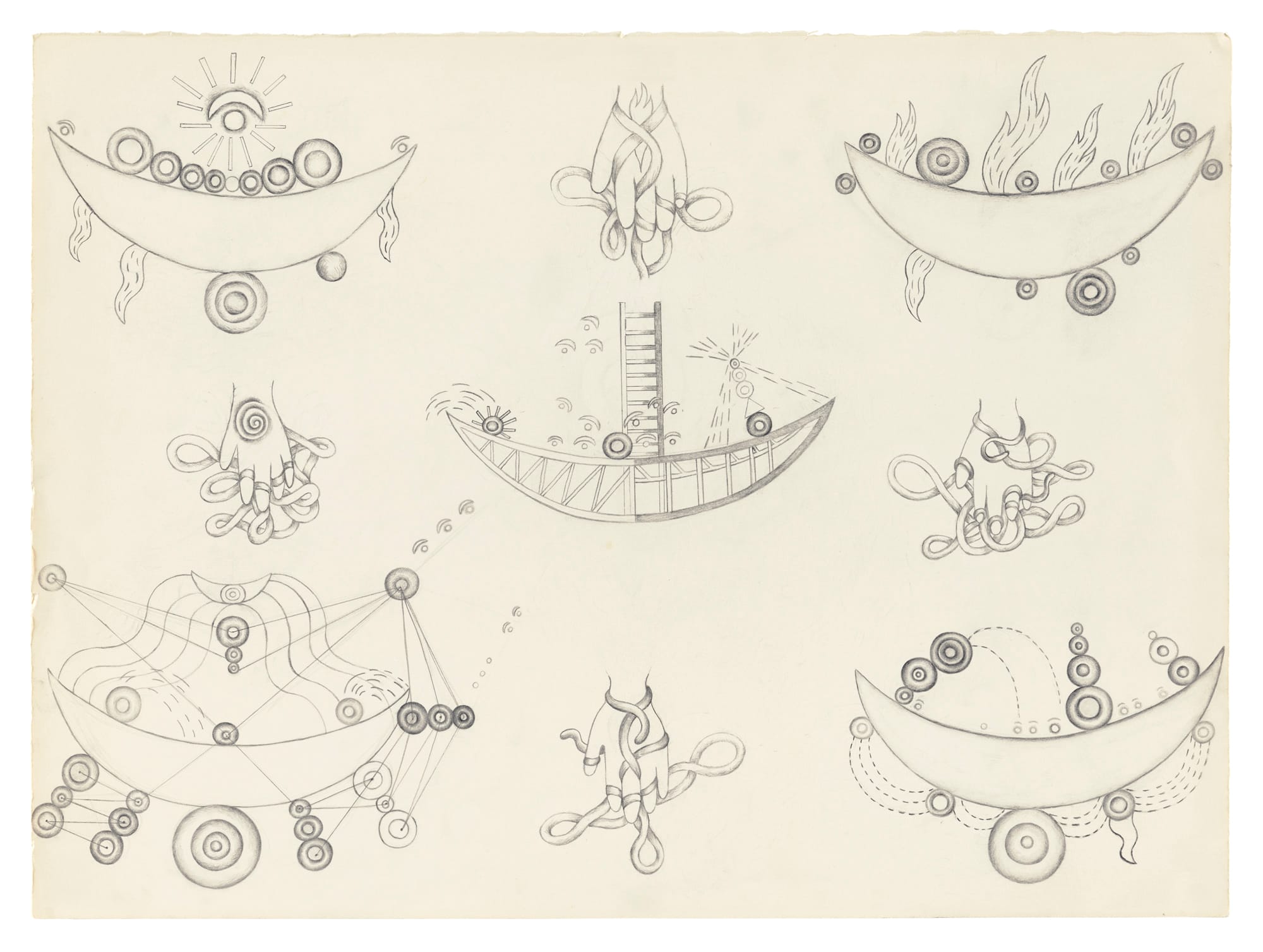 But first, the boats and ropes, as well as the abstract symbology from the trio of 1989 drawings, recur in “Ancestor Signs,” begun in 1999 and completed in 2012. Rocca combines these various elements in nine discrete, syntactically complex images and sets them in a grid, a structure reminiscent of 1960s drawings such as “Game Page with Poodle” (ca. 1968) and “Unscramble” (ca. 1966–67). The pictorial system of that early work comes full circle in her drawings from the past few years. A suite of three from 2017 — “Page A,” “Page B,” and “Page C” — revives a sense of the grid and of a hieroglyphic syntax. The imagery in these drawings is inspired by Rocca’s discovery, in 2016, of dollhouse furniture she saved from the 1950s; a miniature chair, bed, table, birdcage, and piano now reside around her drawing table. The chair rests on her windowsill, and, she says, “because my studio is on the second floor, I can look out, across the way, and see a chair the same size.” Of this interest in matters of perspective, she notes that “things we know we take for granted.” In a curious way, the collapsing of difference and distance between the small the large, the near and far, mirrors the collapsed space between her interior world and the surface of the paper — a process of examination Rocca is not willing to take for granted. Likewise, she says of her recent interest in drawing and painting clouds, “I see them all the time, but [now] I’ve been looking at them.”