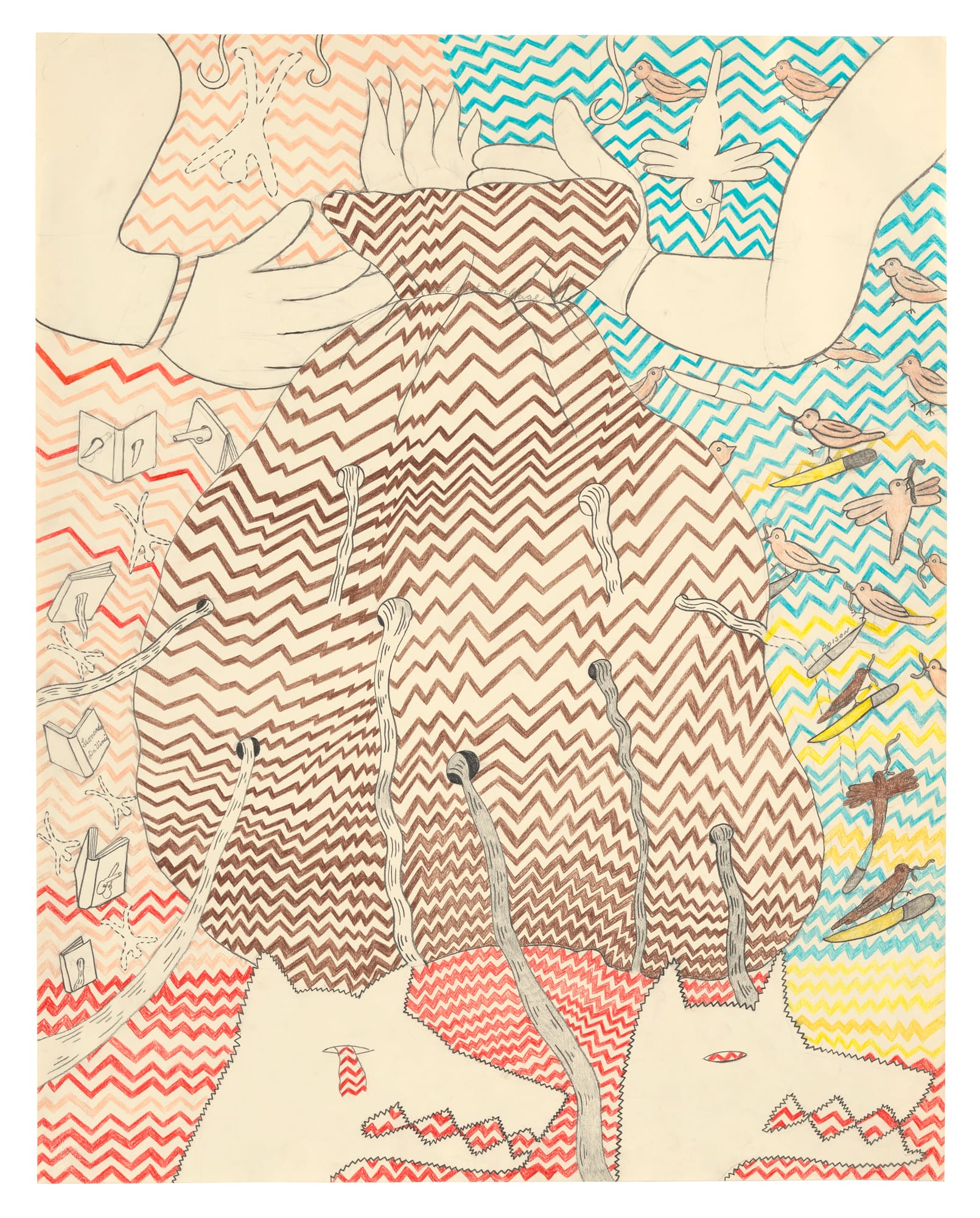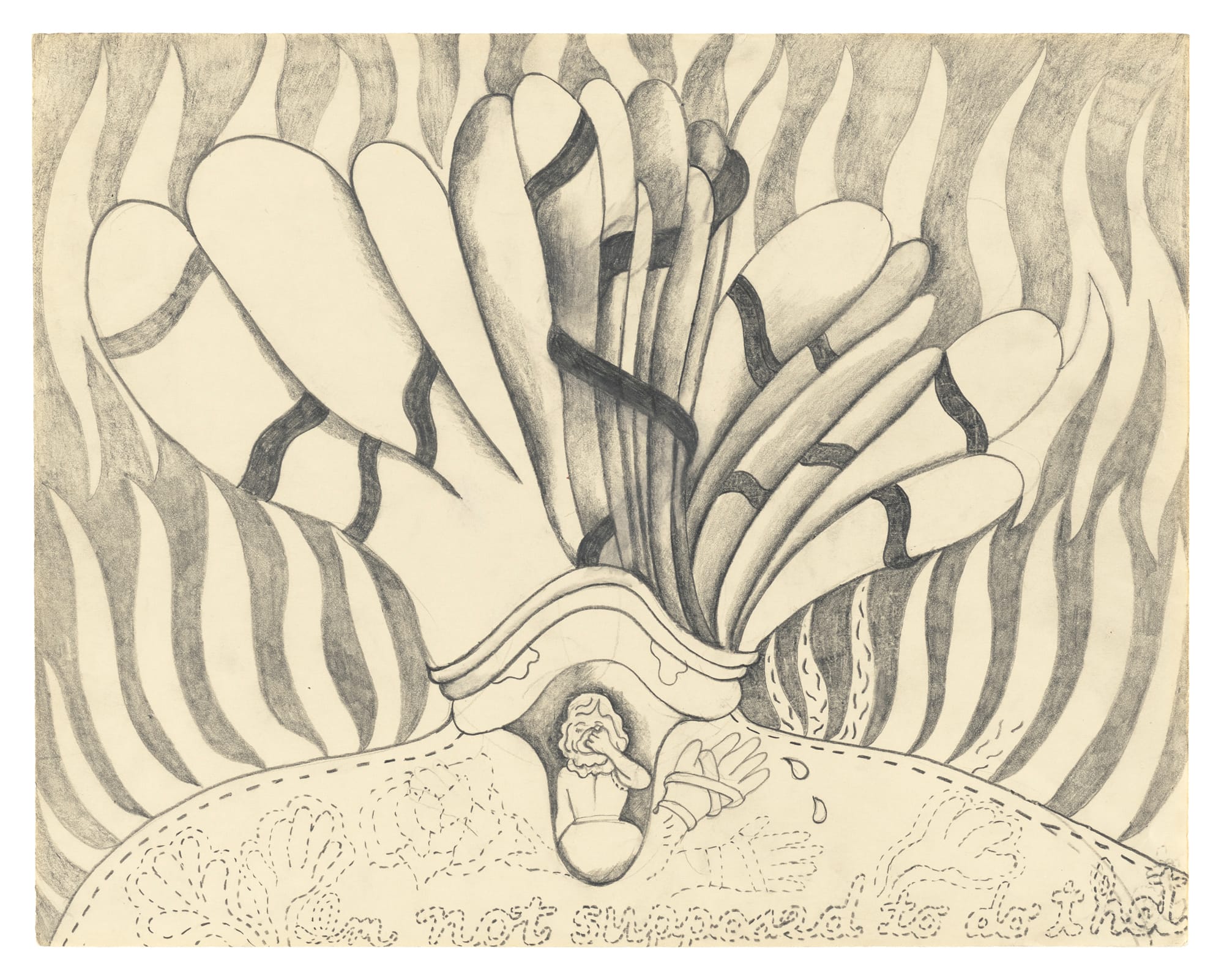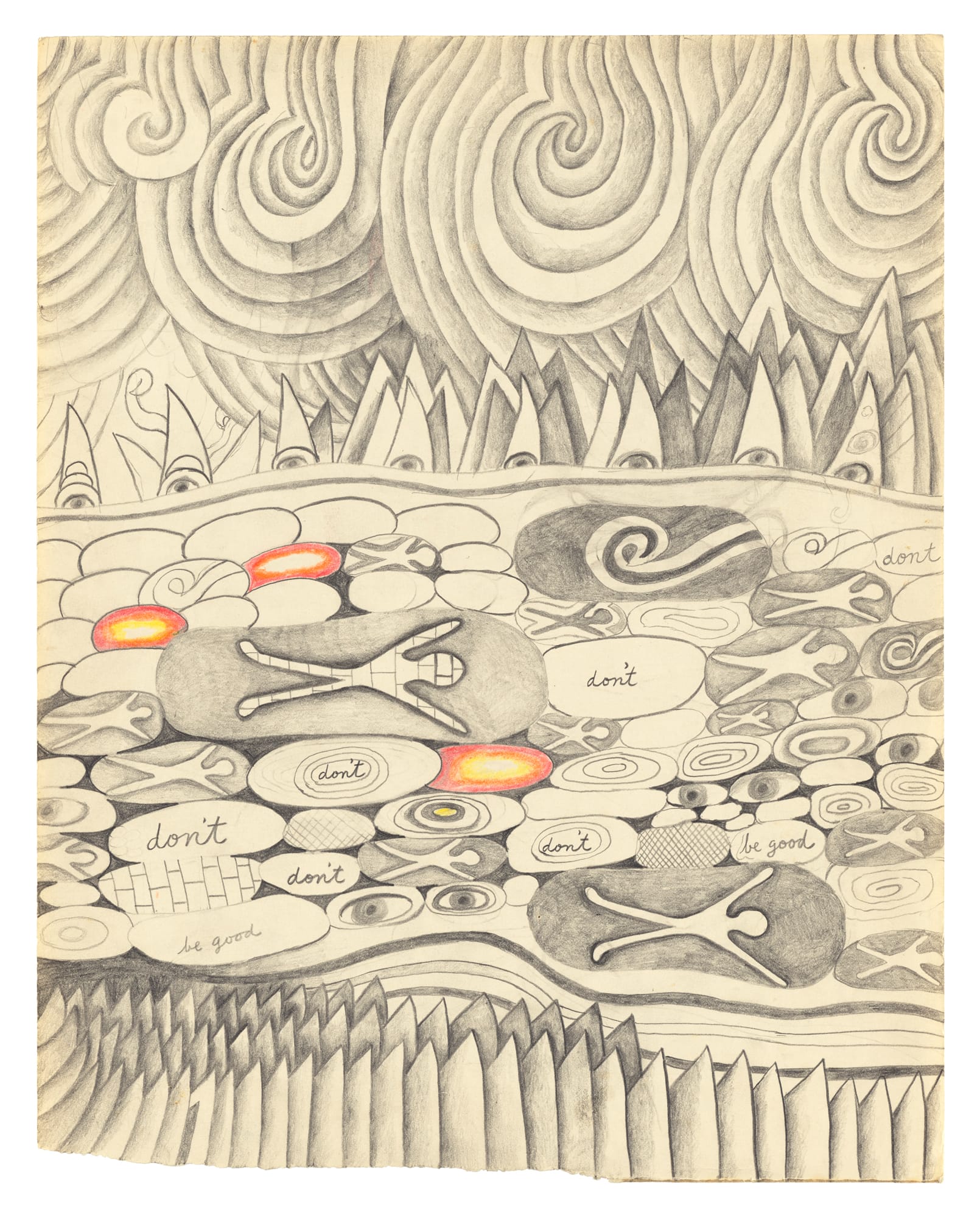 But in 1975, she and her husband divorced, and Rocca stopped making art during the 1970s. When she returned to artmaking in 1981 (also returning to Chicago from the Bay Area), her work was decidedly different. Anxiety, threat, and psychic distress became the subjects of ferocious drawings, with titles such as “It’s a Secret” (1981), “Scary Travel” (1981), and “Don’t” (1981). Rocca maintained some visual themes from her ’ 60s work, including figures, cars, hands, and bags, but her formerly joyful iconographies become syntactically dark, with the addition of knives, poison, and flame-like forms. By the end of the decade, however, her drawings took a curious turn. Rather than try to regain the playful symphony of forms that characterizes her work from the ’60s, Rocca pursued and honed a new area of exploration, her interior life.
