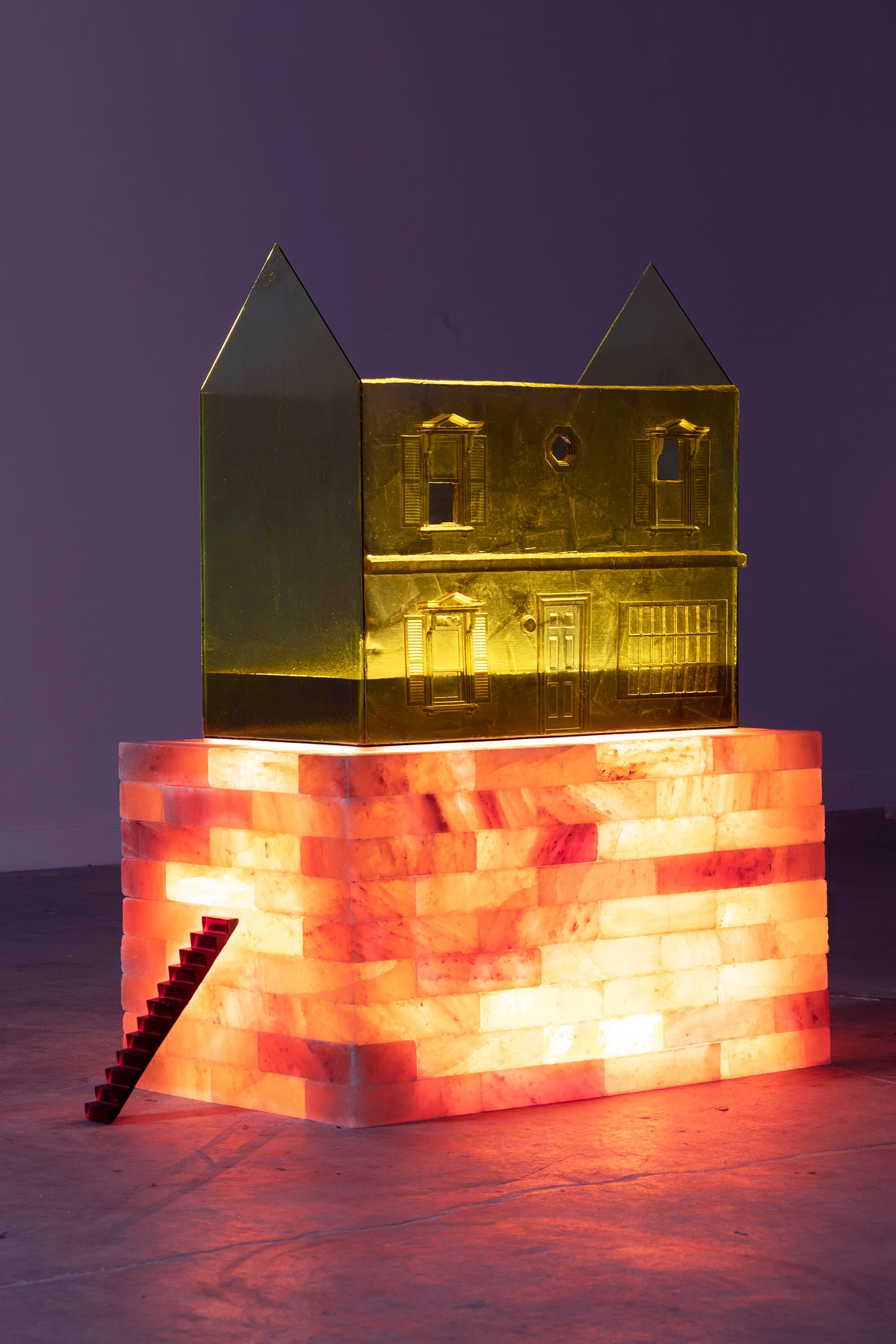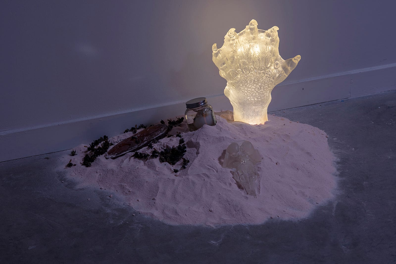 The sculptures and installations included in Sighs and Leers and Crocodile Tears pull from monster movie imagery, implicitly and explicitly evoking films like White Zombie (1932) and The Creature From The Black Lagoon (1954). In various areas of the airy gallery, I encountered mutilated reptilian hands, rising from the walls or mounds of salt, as if eager to pull me closer. In a nod to Candyman (1992), floor works like “Lady with a Ring” (2021) and “Satan Arousing the Rebel Angels” (2021) feature shriveled carpenter bees arranged alongside a puffer fish specimen in a glass jar and a bisected face mold. Delicate and translucent, some sculptures glow from below with light, like the Repository series, which presents crystalline dollhouses perched on a stack of Himalayan salt bricks. At times, it felt like I was surrounded by uncanny props from forgotten movies, a purposeful effect by the artist.