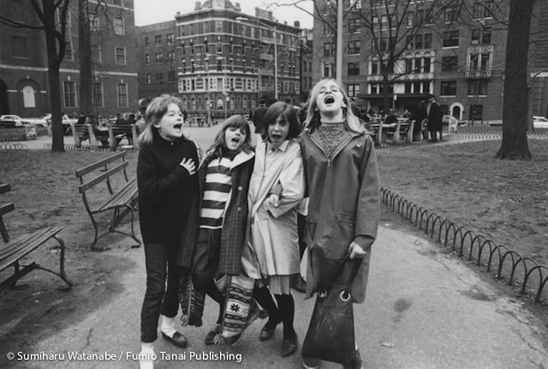 Some of the book’s best photographs are those in which Watanabe makes an appearance. He’s an unseen presence, but we can tell that the people he captures are looking at him, performing for him, amused by him, or feel he is intruding into their lives. In one image, a group of young girls sing in the park on what feels like an autumn afternoon. The diffuse light of a cloudy sky indicates a city that is preparing for winter. The girls pose and perform for Watanabe; three of the four look at him, and at us. In another photograph, a mixed-race couple on the street stares at Watanabe. The woman looks concerned, but also curious. The man puts on a stern face. What did these people think of the young man behind the camera?