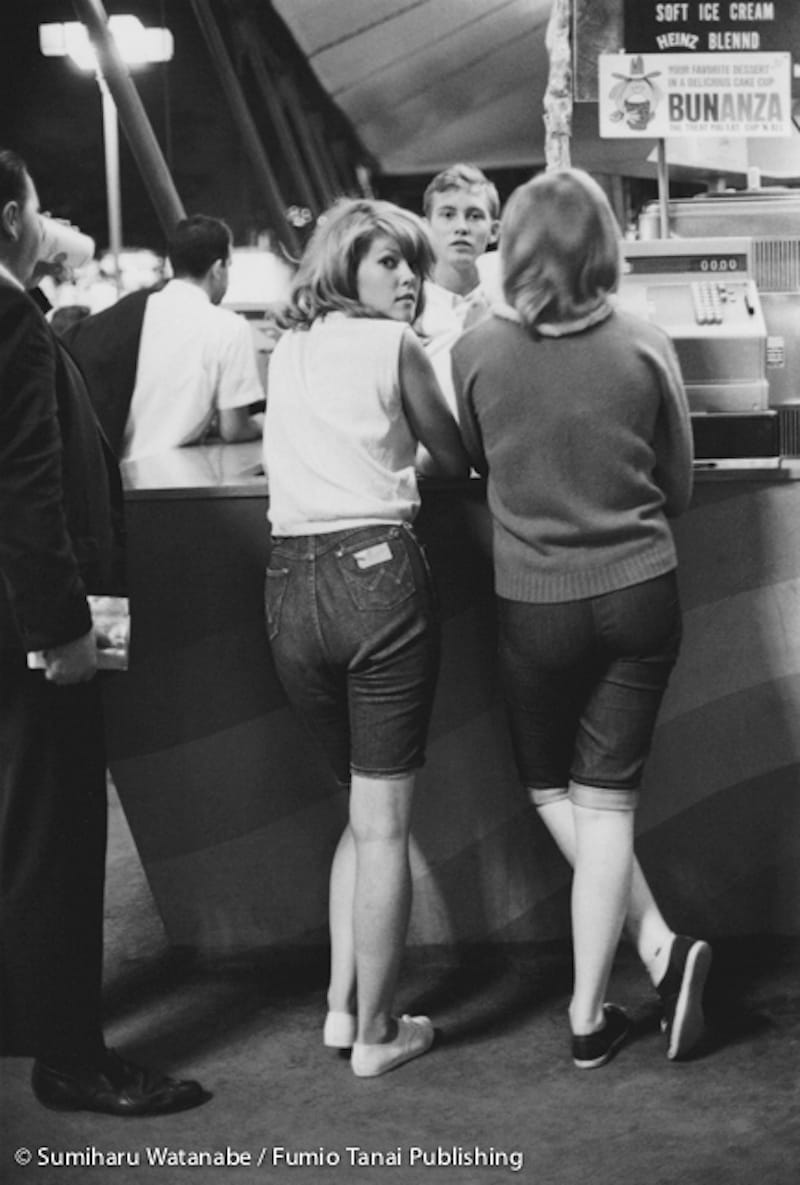 For that matter, what did he think of them? It’s easy to see his affection for the city, but some of his images evince a coldness and confusion toward its inhabitants. He is not always in dialogue with the people he takes pictures of. Sometimes he merely captures them as specimens of a strange place. For example, a young woman on a summer evening turns around from a food stand and happens to see Watanabe capturing her likeness. The young man behind the counter notices at the same moment and looks unsure.