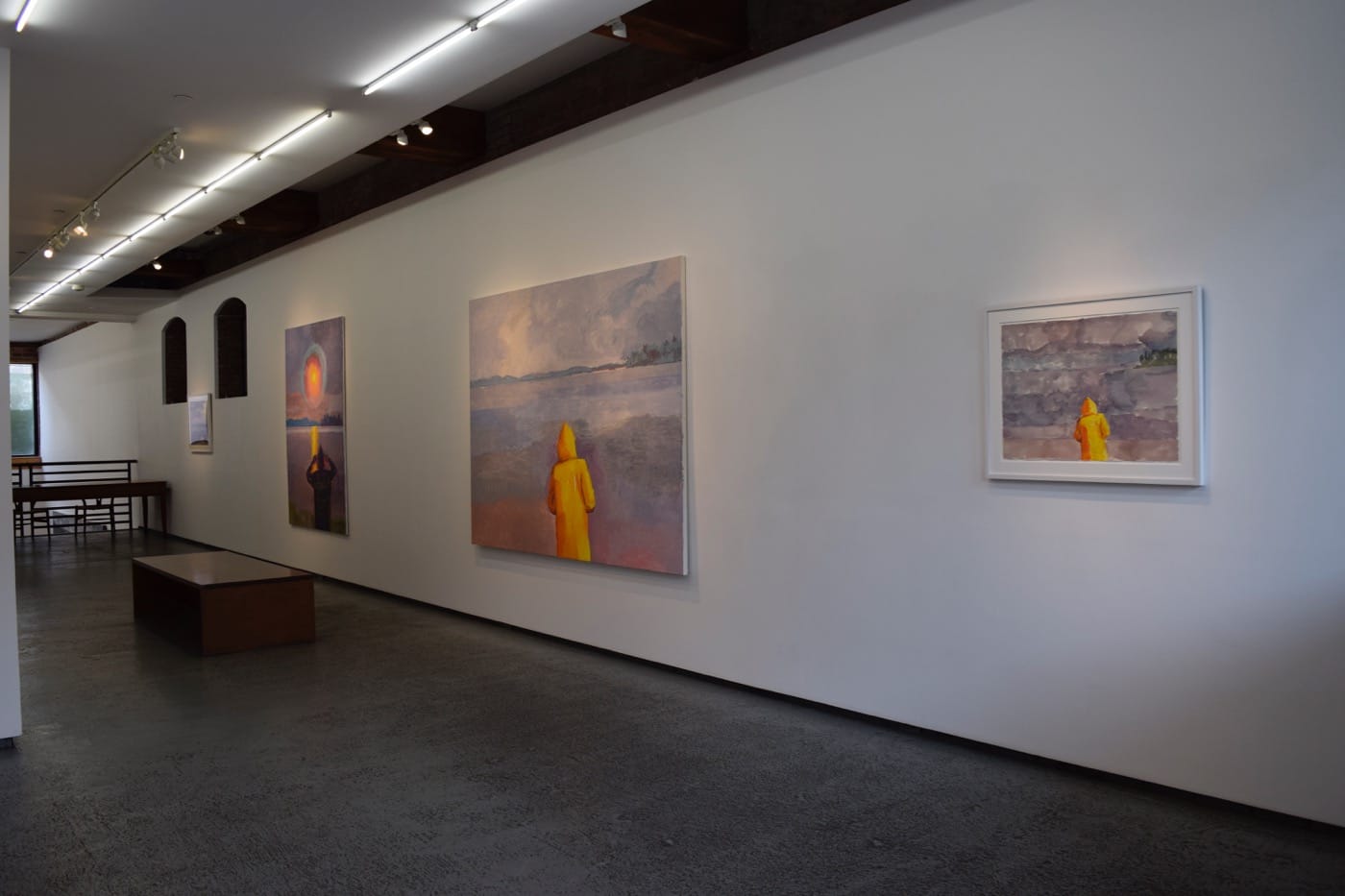 The most recent of Nickson’s works in the exhibition, executed in 2017, are notably looser and more freely painted than the earlier paintings and drawings on view. Witness the “Sunrise Fog II” watercolor and “Yellow Jacket Fog,” a watercolor of a half-length figure in a hooded yellow jacket, seen from the rear, against a mass of mauve-grey-blue-rose patches that slowly resolve themselves into a suggestion of some unnamed place in Maine. The geographic similarities are obvious in all of these works. A large canvas, “Maine Grey: Yellow Jacket,” (2017) described in the catalogue as a work in progress, echoes the composition and setting of “Yellow Jacket Fog,” but clarifies and simplifies the watercolor’s floating blotches and washes into more coherent expanses — without losing any of the immediacy of the work on paper. Yet the large canvas already has the monumentality and sense of timeless geometry that we associate with Nickson’s paintings. A glow of rose at the bottom of the picture envelops the yellow-clad figure, subtly warping the space and, perhaps, subtly shaping the implied, elusive narrative. “Maine Grey: Yellow Jacket” looked quite complete, among the other works in the show, but Nickson is also well-known for spending years fine tuning his images, without — miraculously — killing the impulse that generated the picture in the first place. If he intends to work more on “Maine Grey: Yellow Jacket,” we’ll just have to wait and see what happens.