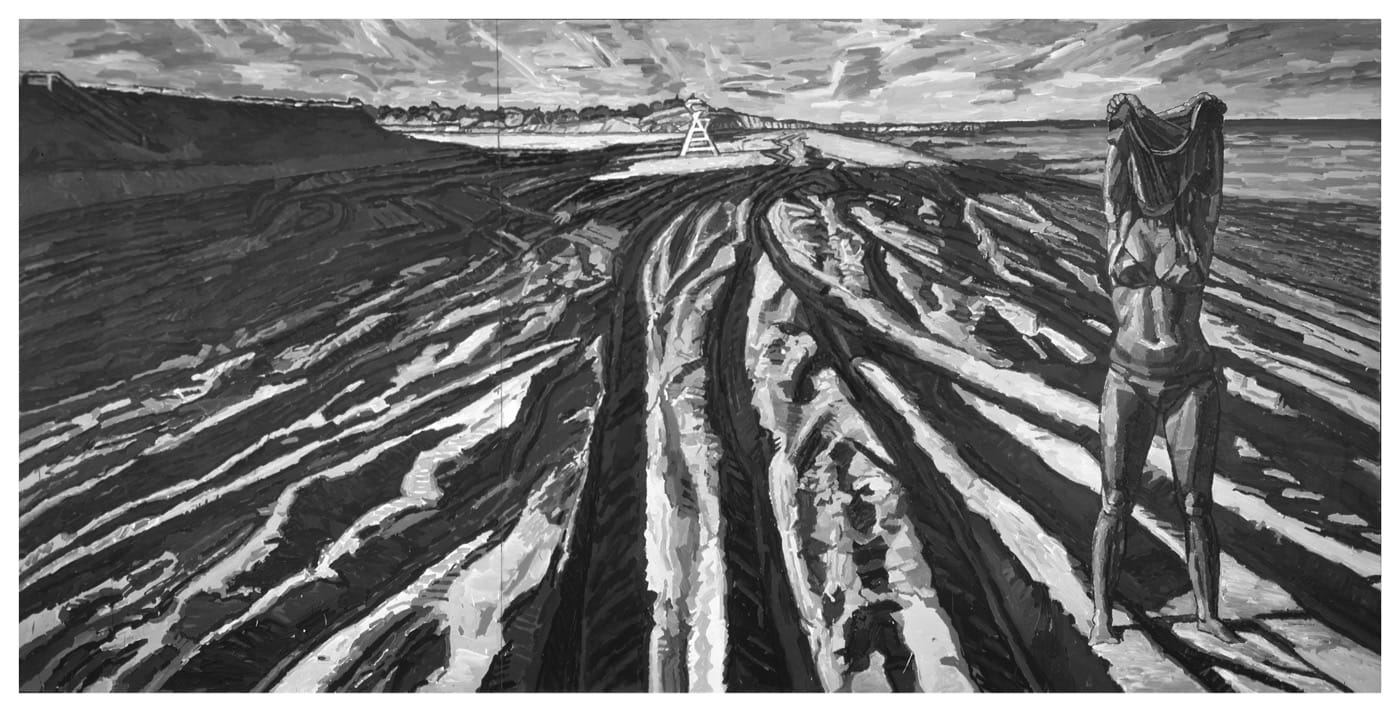 More paradoxically, even though we are conditioned to read the convergent diagonals of the painting’s setting as indicating deep space, we are not exclusively pulled into a fictive distance by the rippling slashes in the sand. Instead, we are forced to consider the entire image as an eloquent accumulation of different kinds of marks and tones across a generous expanse of surface. We are also made acutely aware of the openness and featurelessness of what feels like a very specific place. As is always true in Nickson’s major works, an imprecise narrative is suggested, but remains just out of reach. We search the rest of the painting for clues and are forced to invent our own solutions. Ultimately, however, even the hint of narrative in this mysterious image is overwhelmed by the tension between the illusion of space, and the bulk and amplitude, of the applied pigment, assertive evidence of paint having been deposited on a flat surface by a particular hand.