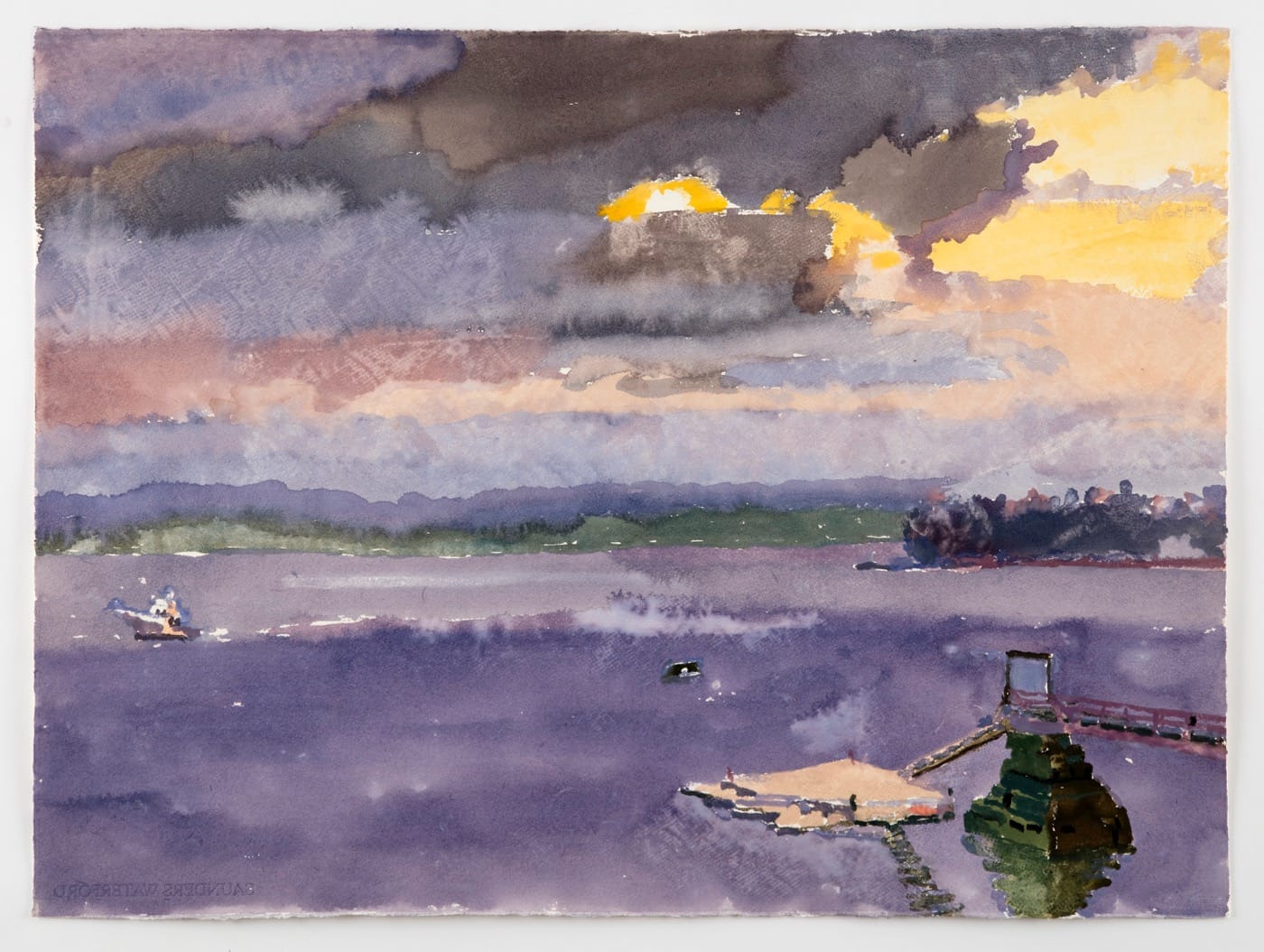 “Sunrise Fog II,” a2017 watercolor plainly bears this out. It presents a view across water toward distant hills, with a glimpse of beach on the left and a pier of some kind on the right. The moist, morning, seaside air and the new, low light piercing the fog are palpable. Yet this intense sense of place and time is created solely by loose pools and touches of thin, flowing paint, and by carefully adjusted, inventive hues, with only the most economical indications of incident. The longer we spend with the picture, the more it threatens to dissolve into explorations of pure, albeit highly evocative color relationships.