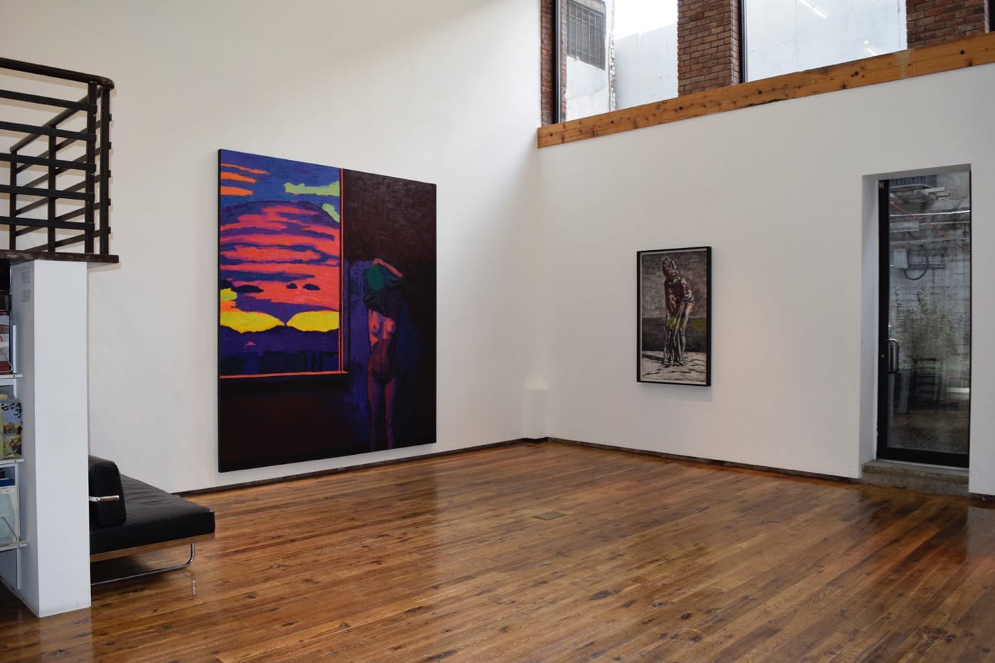 Nickson is rightly known for his saturated, glowing color, but he’s also a master of black, white, and grey tonalities. Witness the exhibition’s large, muscular charcoal drawings and one of the most potent paintings on view, “Tracks” (1982-1991). Even at an impressive eight by sixteen feet, this tough, no-holds-barred canvas commands attention less because of its size than because of its rich orchestration of whites, off-whites, greys, and blacks; its range of vigorous marks; and its powerful sense of fading light. Everything converges in the top quarter of the painting where the deep grooves punctuating the beach, a triangle of dunes, and a slice of sea meet below an emphatic horizon line and a wide band of sky, as agitated as the gouged expanse of sand. A single sturdy female bather faces us, arms above her head, face hidden by the shirt she pulls off. Her strongly modeled frontal form reinforces, paradoxically, our awareness of the literal flatness of the canvas.