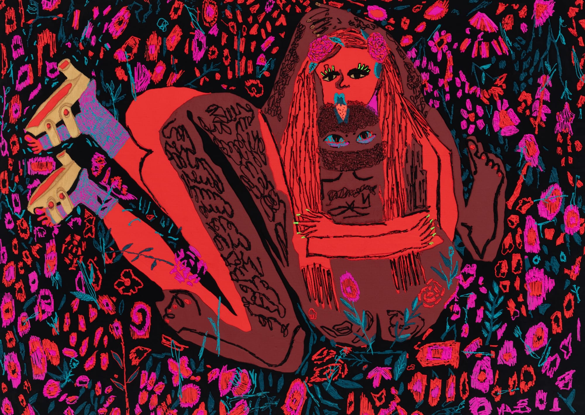 Men are mostly absent from Wheat’s densely populated gardenscapes. The exception is “Rose Garden'' (2023), where a young woman straddles a hairy man in a garden of neon magenta roses, a glimpse of leisure and ecstasy. As the two figures are the same size, Wheat uses a hierarchy of scale to signal their equality in a utopian microcosm.