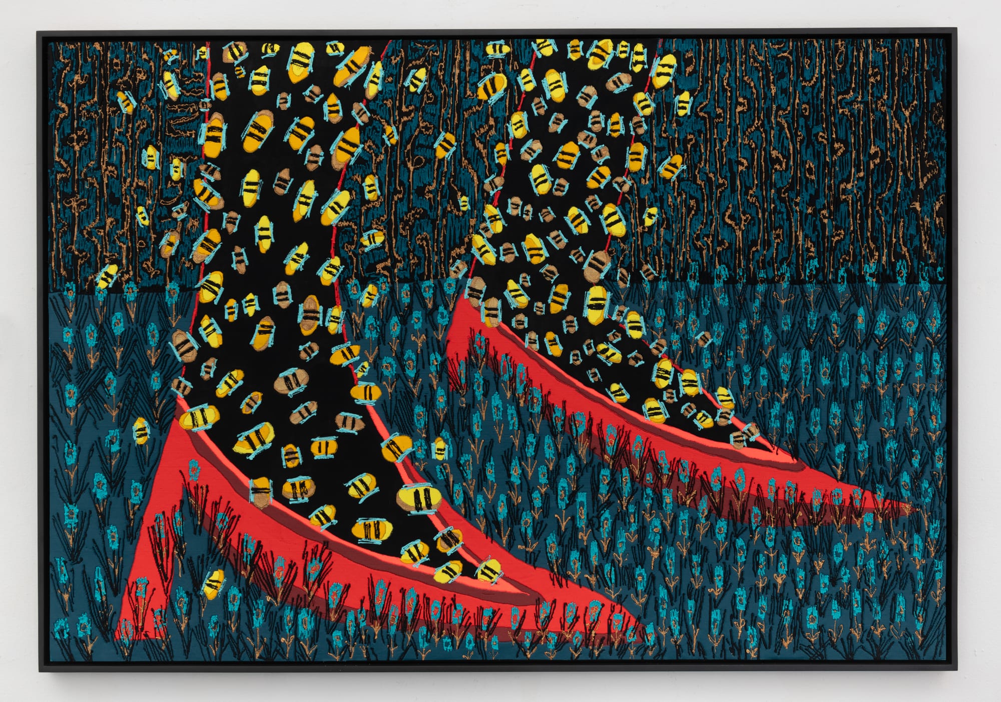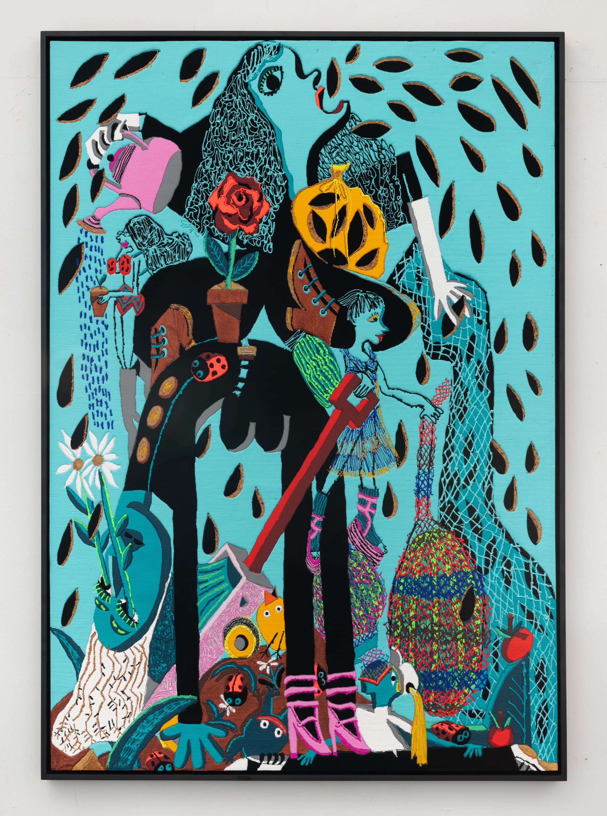 At first glance, the paintings resemble knitted textiles or complex beaded tapestries. Upon further inspection, though, the medium is revealed as acrylic and gouache paint pushed through aluminum mesh via syringes, cake-decorating paraphernalia, and other surfaces. This is an involved process, as evidenced by “Seed Fountain” (2023), in which a woman spews giant brown seeds out of her open mouth, watering a garden with one hand and casting a net with the other. The serpentine detailing of her net and hair are rendered in turquoise and black against a bright blue sky. Classic garden imagery, such as red apples, ladybugs, and baby chicks, are piled on a small patch of soil, a nod to the many roles women play in the creation and tending of life.