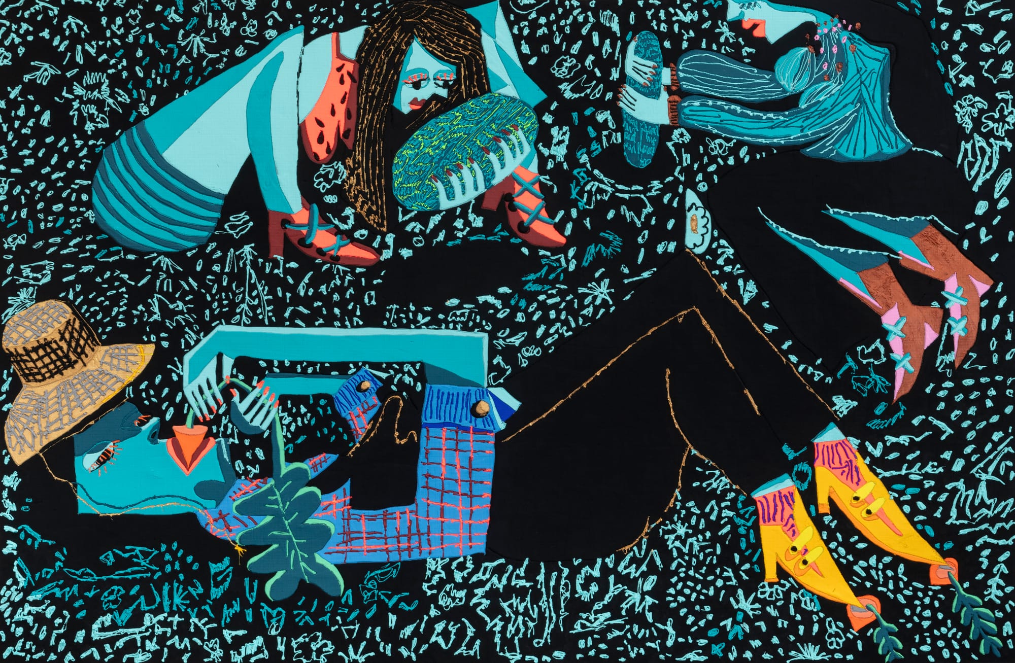 Rather than embrace individualistic “hustle culture,” the women in her paintings work communally and find time to rest.