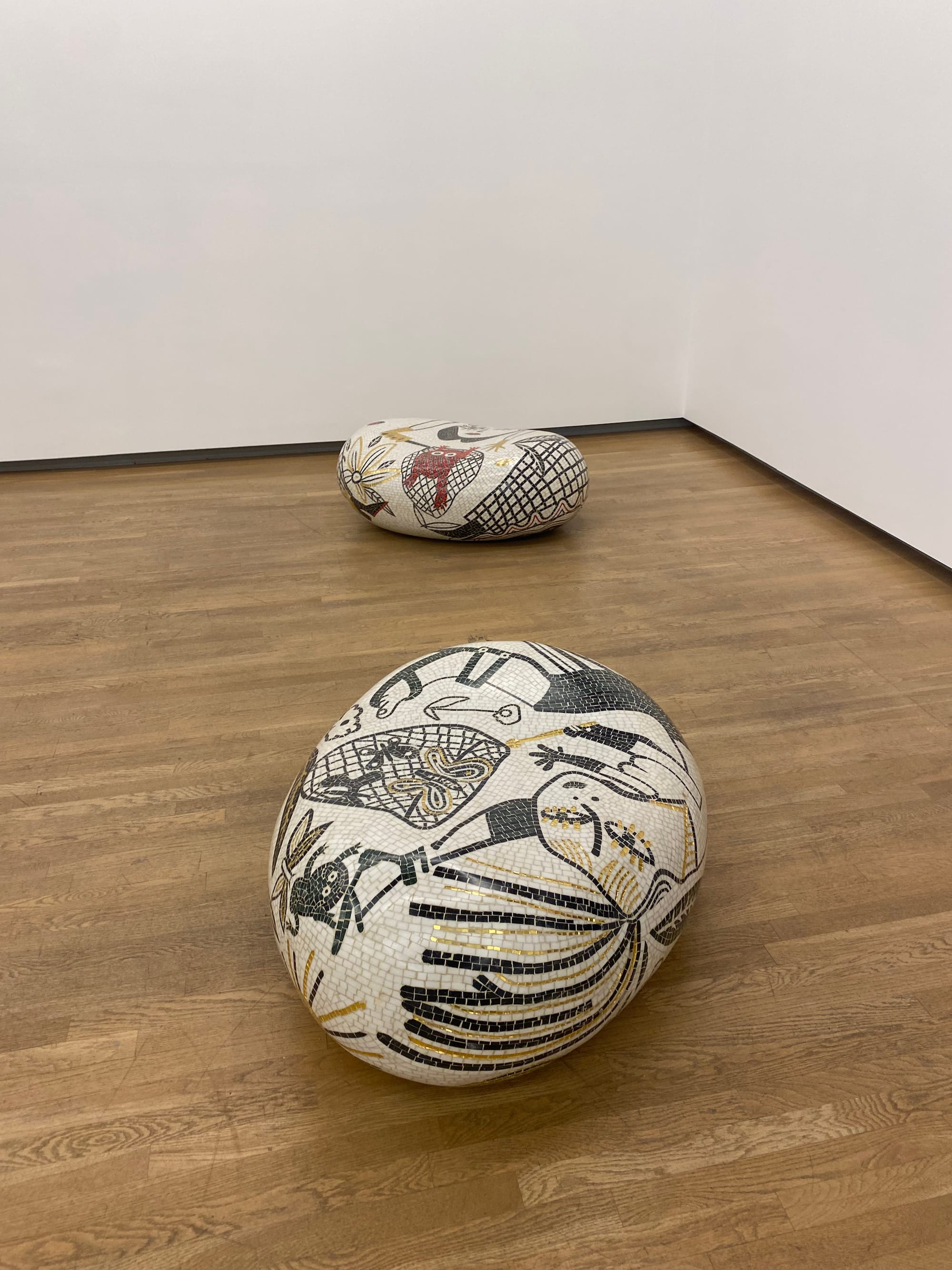 Three sculptures inspired by ancient Egyptian, Greek and Roman mosaics are covered in white, black, red, and gold tile featuring folky frogs, butterflies, and abstract female faces. Approximately the size of a small park bench, these sculptures mimic pebbles you might find along a stream. Made of stone, glass, and grout, Wheat offers viewers a site to rest, in line with the ethos of her paintings.