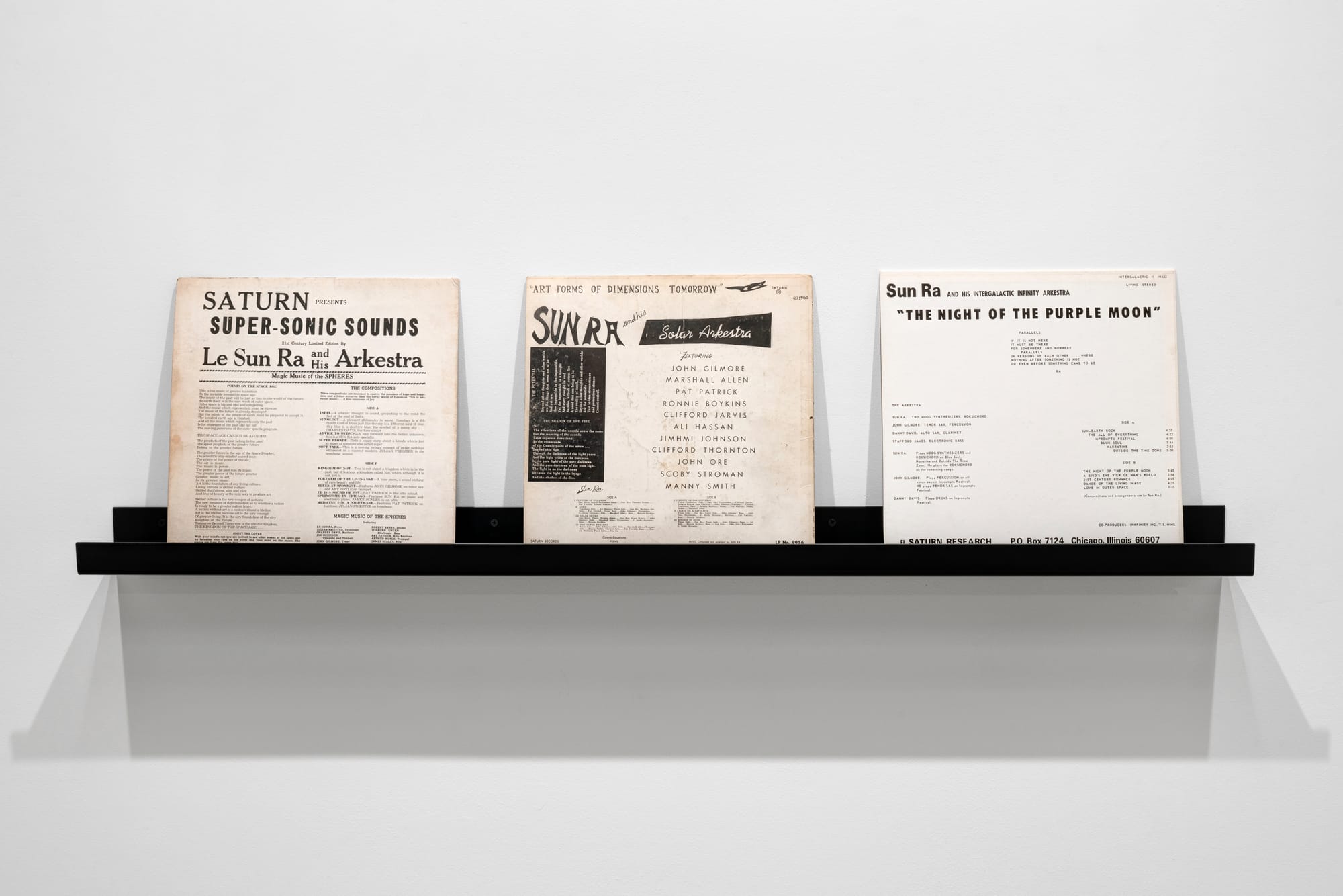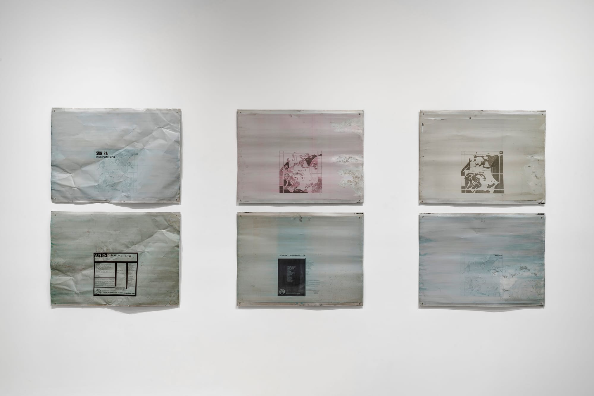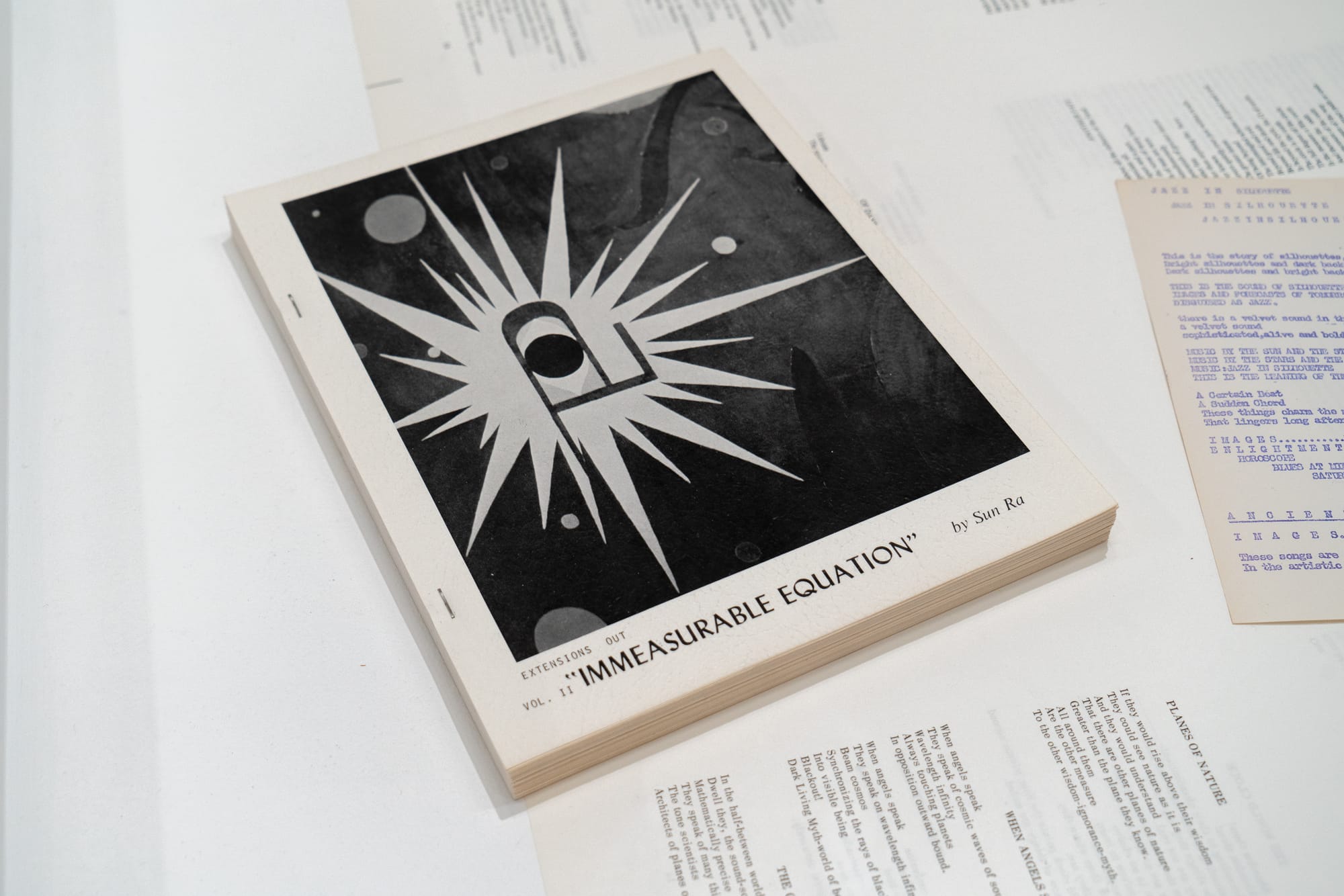 The show is anchored by four publications that collect Sun Ra’s poetry, though only two, The Immeasurable Equation and Extensions Out: The Immeasurable Equation Vol. II (both 1972) were formally intended as such. The first two are liner notes for the early albums Jazz By Sun Ra (1957) and Jazz In Silhouette (1959) that happen to double as chapbooks. Also present are eight enticingly stained aluminum lithographic offset printing plates, some uncut signature sheets, and three albums from Sun Ra’s periods in Chicago, New York, and Philadelphia that all feature poetry in some form. On the occasion of the exhibition, Corbett vs. Dempsey has printed facsimile copies of all four books.