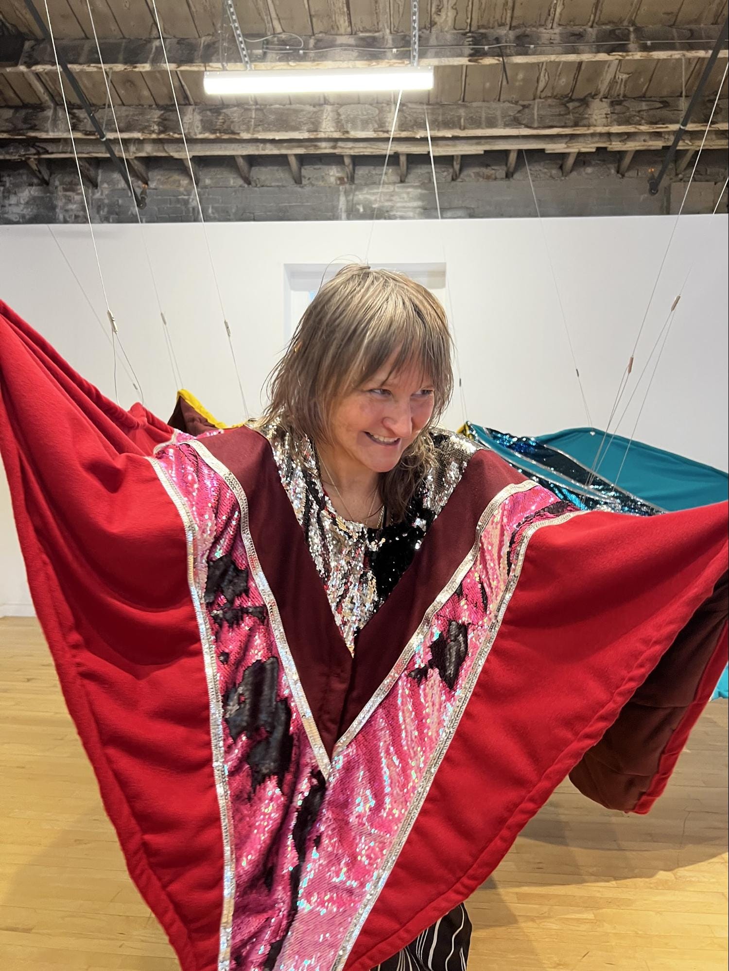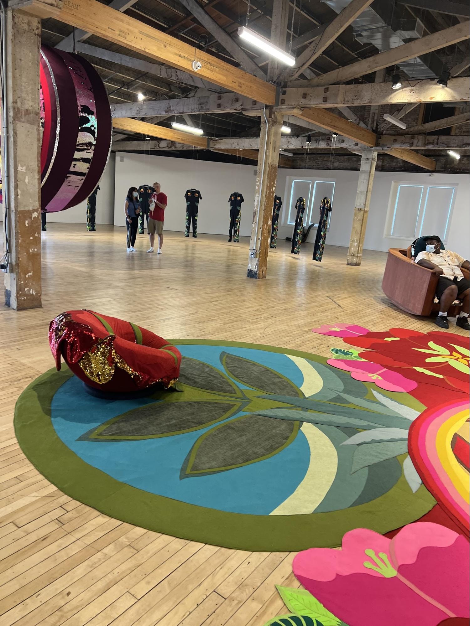 I saw a family with three young kids taking turns on a giant rocking chair with chimes, spinning in the flowers, trying on sequined capes, taking photos. In the capes they looked like superheroes. The capes are made from weighted blankets, which became popular during the pandemic to alleviate anxiety and make us feel safe. The exhibition seems to contemplate the social, mental, and emotional challenges we have all faced as the result of recent global traumatic events. The gallery goer is not just a viewer, but also a participant in a sensory experience that is individual but among others. Sun Seekers seems to say: we’ve been cooped up for too long; it’s time to get some fresh air.