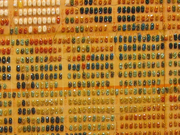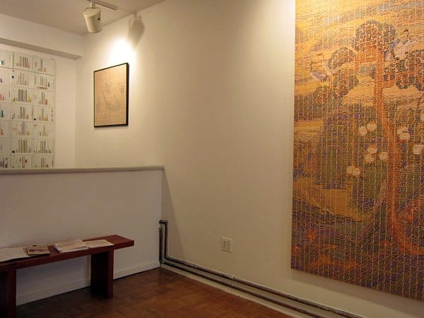 One of those artists, Sung Ho Choi, is currently having a solo show in the space. The exhibit, entitled The Sung Ho Choi, is framed on two sides by impressive panel pieces constructed of lottery tickets. At the end of the gallery is another lottery ticket piece, as well as an American flag completely constructed from rice and a grid of rejection letters Choi carefully lined with colored marker.