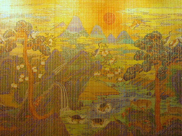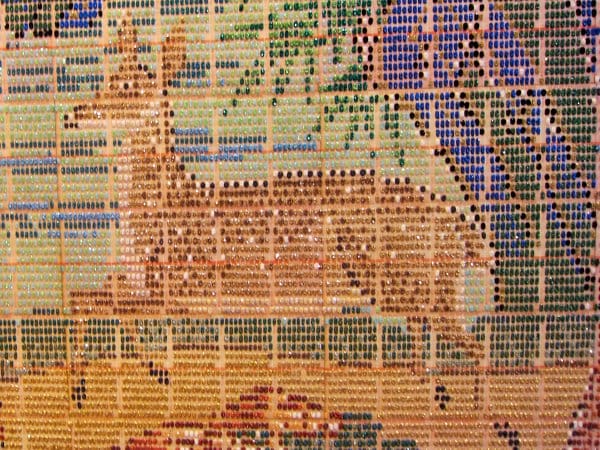To say that Choi’s work must be time-consuming is an understatement. The meticulous creation of his work is right in line with the obsessiveness of artists like On Kawara. I couldn’t stop studying the perfect dots of glitter formed in the punched holes of used lottery tickets, then stepping back to see those patterns morph into a colorful landscape with glimmering animals. The presence of deer, turtles and cranes surrounded by trees, water and wisps of clouds suggested a depiction of the ten symbols of longevity, a traditional Korean motif of luck. The beautiful totems were constructed from cast-off, failed grasps at millionaire dreams; their glint coming from a cheap craft supply instead of gold.