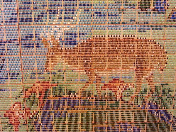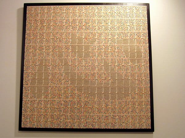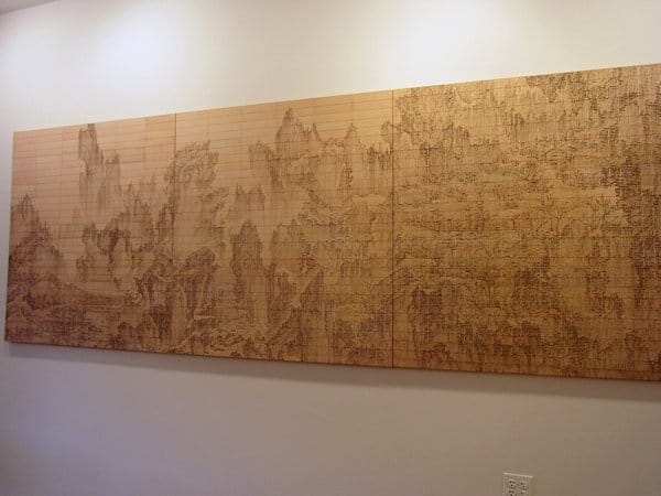 There are two other lottery ticket pieces in the show, both just as impressive in their crafting, although falling short of the emotional impact of “Forever Young.” “Dreamscape” is a serene landscape made of shaded pointillist lottery ticket dots that, at a distance, could be mistaken for a 15th century scroll. “Mind Blind,” with its negative of the Chinese symbol for hope, lacks a bit of subtlety, but is a strong visual statement on the ritual and faith involved in buying lottery tickets.