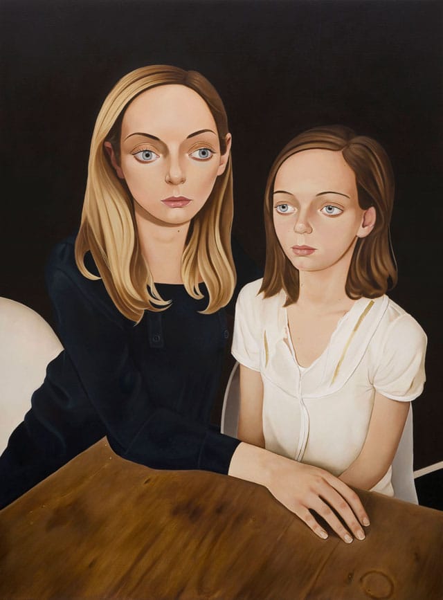 In his best paintings, Stichbury walks a fine line between the unblemished and the grotesque without showing his hand, either literally or metaphorically. We tend to associate flawlessness with beauty, but Stichbury’s smooth, perfectly modulated, tight surfaces are unsettling. His paintings don’t strike me as portraits of people but of people who want to look as smooth and flawless as dolls. In “Estelle & Helena,” Estelle’s head is a perfect oval; she looks like an egg with eyes that are just a little too far apart and a little too big. The carefully manicured eyebrows rise uniformly above the eyes, like the wings of seagull. The bridge of her nose drops down from where the eyebrows end, like a swimmer executing a perfect dive. Other than Estelle and Helena’s gray eyes and rose lips, Stichbury works with a palette that consists of different tones of ocher, brown, black and white. The fact that Estelle is posed with whom you assume to be her adolescent daughter adds a note of creepiness to the painting. After all, what legacy is Estelle passing on to Helena?