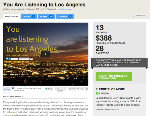 Eberhardt’s project is ambitious — $30,000 total to support to hire some “top-notch developers” — but fortunately he has a wide range of pledge options. One US dollar will get you a “URL2.LA Founder” badge for your site, and $15 gets you a downloadable mix album of the site’s greatest hits. Those who fork over $3,000 can get URL2.LA installed in a gallery or stage of their choice.
