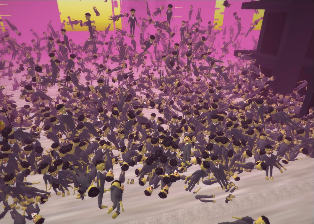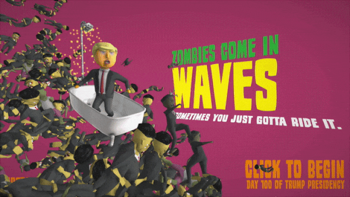 I am surfing through a city, riding a wave of zombies in a bathtub spewing golden showers. I am Donald Trump, on the 100th day since my inauguration, gazing maddeningly at my desolate surroundings while my sandy head rug fights the wind to cling to my scalp, flopping like a rabid dog’s tongue. This is who I am, at least, in Zombies Come in Waves, which developer Andrew Wang and his team recently produced for the Global Game Jam. The world’s largest game creation event, it took place January 20–22 in 702 sites across 95 countries.