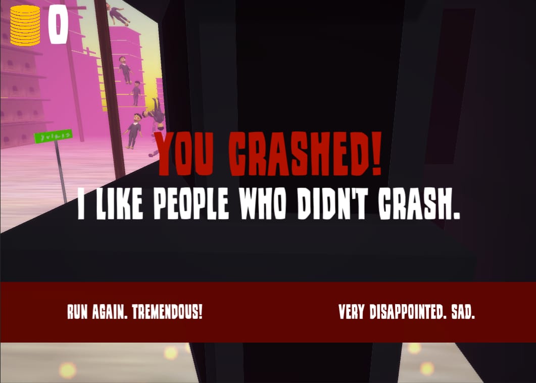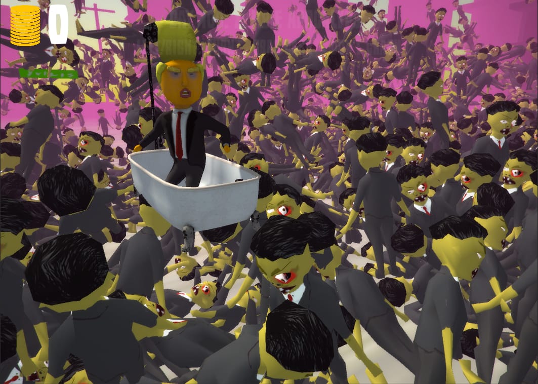 Created in just 48 hours, Zombies Come in Waves has a simple premise: collect coins as you surf through this post-apocalyptic world, and don’t crash into any buildings. As you steer your orange-faced character over his diseased former constituents (who moan and groan loudly), recordings of Trump play in the background, spewing familiar quotes like, “Our country’s going to hell” and “Everybody takes me very seriously.”