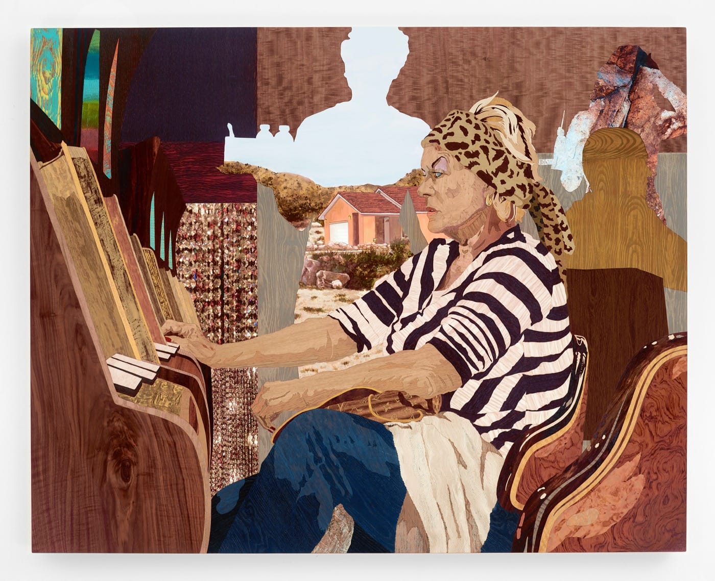 It’s not painting, not drawing, (for the most part, though a few recent works do feature applied pigment). But you likely won’t know until you are within striking distance (almost close enough to touch) of Alison Elizabeth Taylor’s collages that the work is marquetry, a kind of rigorously illustrative technique consisting of layers of carved wood. The actual architecture of the figures and the ground is cut and shaped out of veneer, in which the colors are calibrated and the grain of the wood is angled just so, to mimic the texture of a woman’s hair pulled up tight into a bun, or the long, smooth bridge of a horse’s nose highlighted by the sun, or skin on the left elbow of someone playing the slots, or the rust stains on the back of an old, ceramic bathroom sink. You want to follow all the topographical shifts that shape and contour the inhabitants of her collages, but Taylor makes so many clever turns they are dizzying. There is almost too much sumptuous elaboration of the everyday — so much so that nothing is really allowed to be quotidian. A tethered horse in a field seems to be made up of at least 50 different hues and patterns. You look at the horse for its riot of mottling and almost miss the two naked bearded white men standing next to it. As soon as I noticed the complicated nature of the work in The Backwards Forward, I regretted not having arrived earlier so I could give this show more time.
