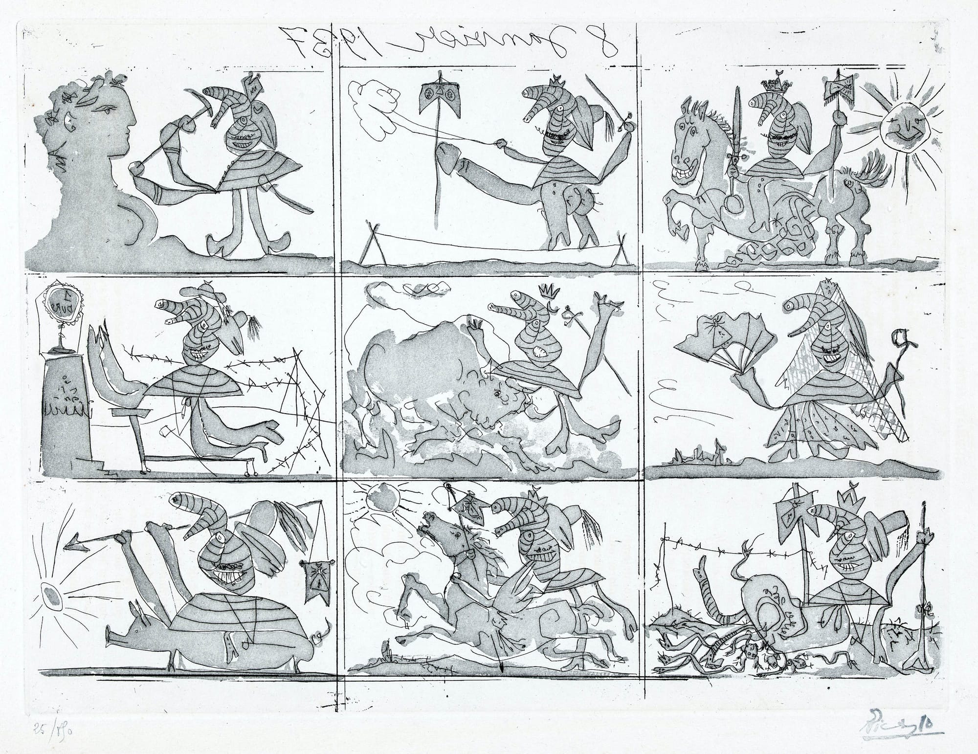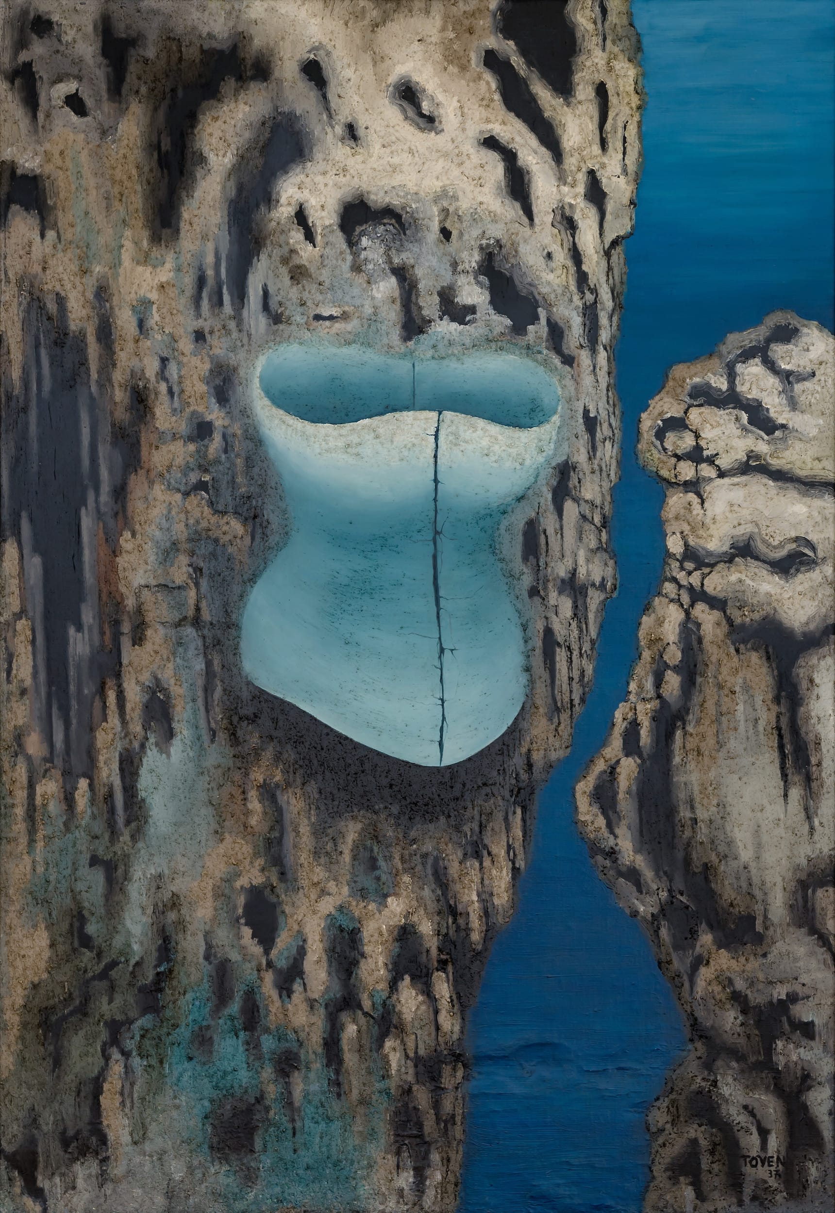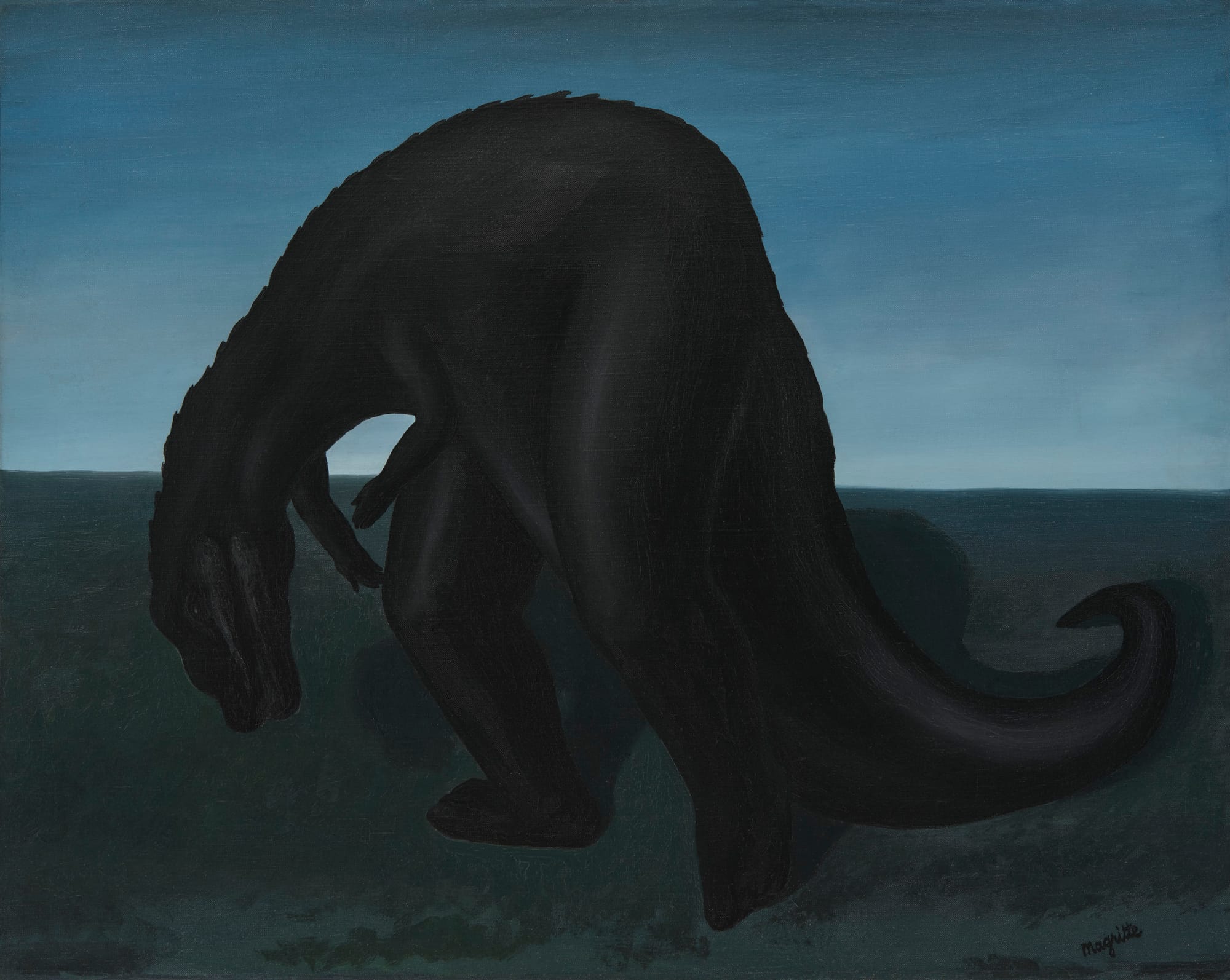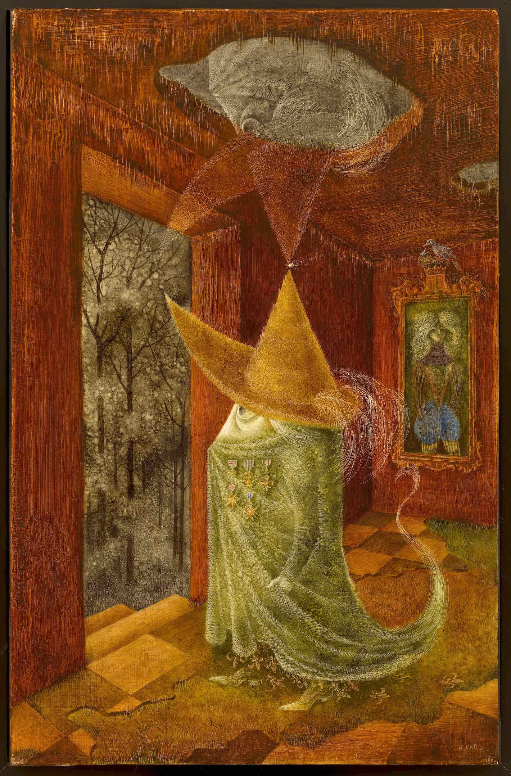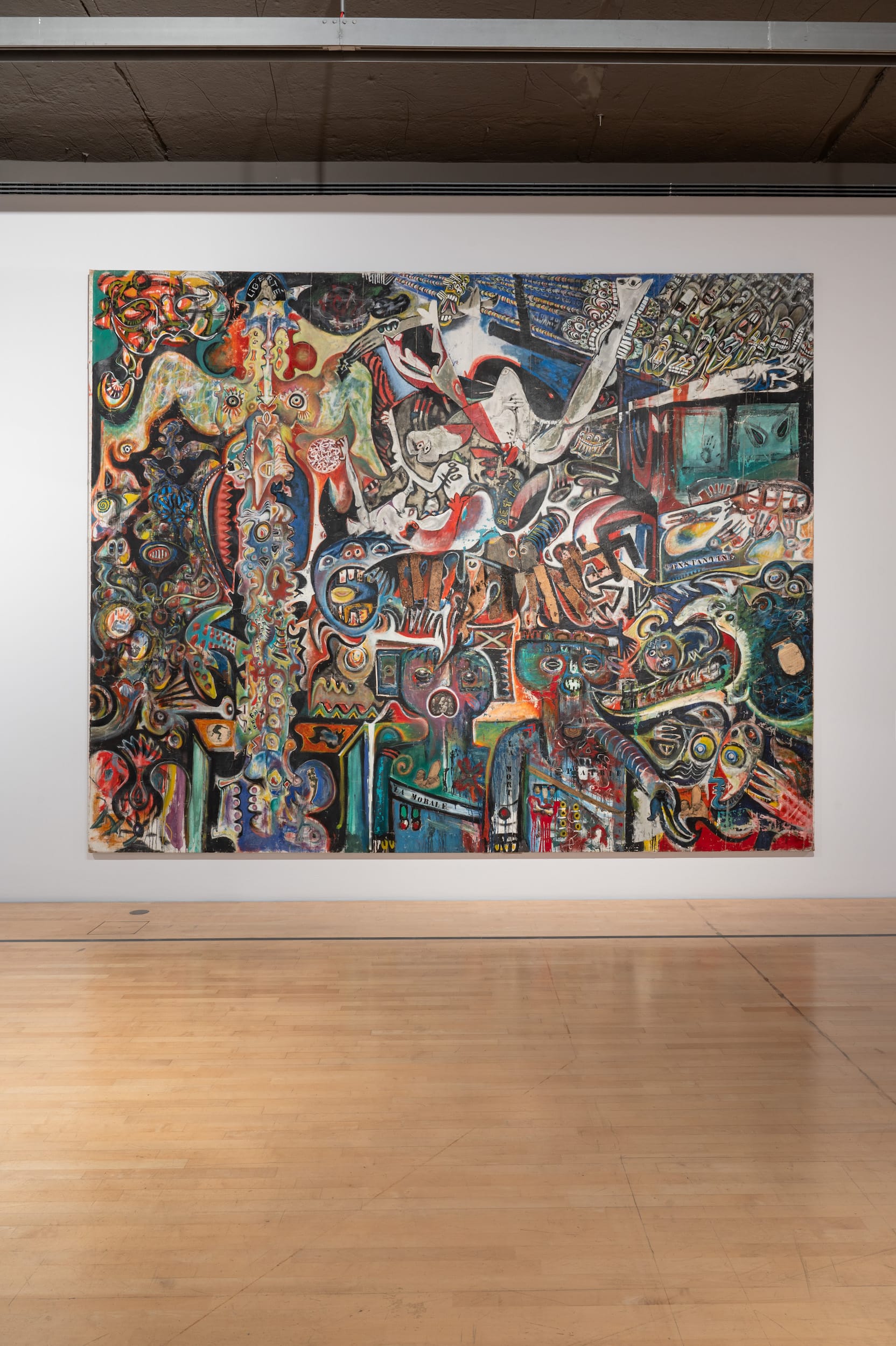 Political and philosophical exposure advanced the artistic evolution of several artists as well. When Cuban Wifredo Lam, like Breton, exiled from France to Martinique, he came into contact with the prominent anti-colonialist thinkers and writers Aimé and Suzanne Césaire, who published the Surrealist journal Tropiques (1941–44). As the wall text notes, this propitious meeting advanced Lam’s syncretic Afro-Caribbean style. His macabre etching series, Annonciation (printed in 1969–71), which depicts entwined, tortured skeletal creatures, accompanied by Aimé Césaire’s poems, exemplifies Surrealism’s power to convey unspeakable horrors — as do many additional works, from Max Ernst’s allegorical “Angel of Hearth and Home” (1937), painted in response to Francisco Franco’s brutal victory over the Republican fighters in the Spanish Civil War, to the collectively made “The Grand tableau antifasciste collectif” (Great Collective Anti-Fascist Painting, 1960) — a sprawling, dense canvas teeming with convulsed limbs, devouring mandibles, and intimate, torn body parts, painted to protest the torture and rape of Djamila Boupacha, an activist of the Algerian National Liberation Front (FLN).