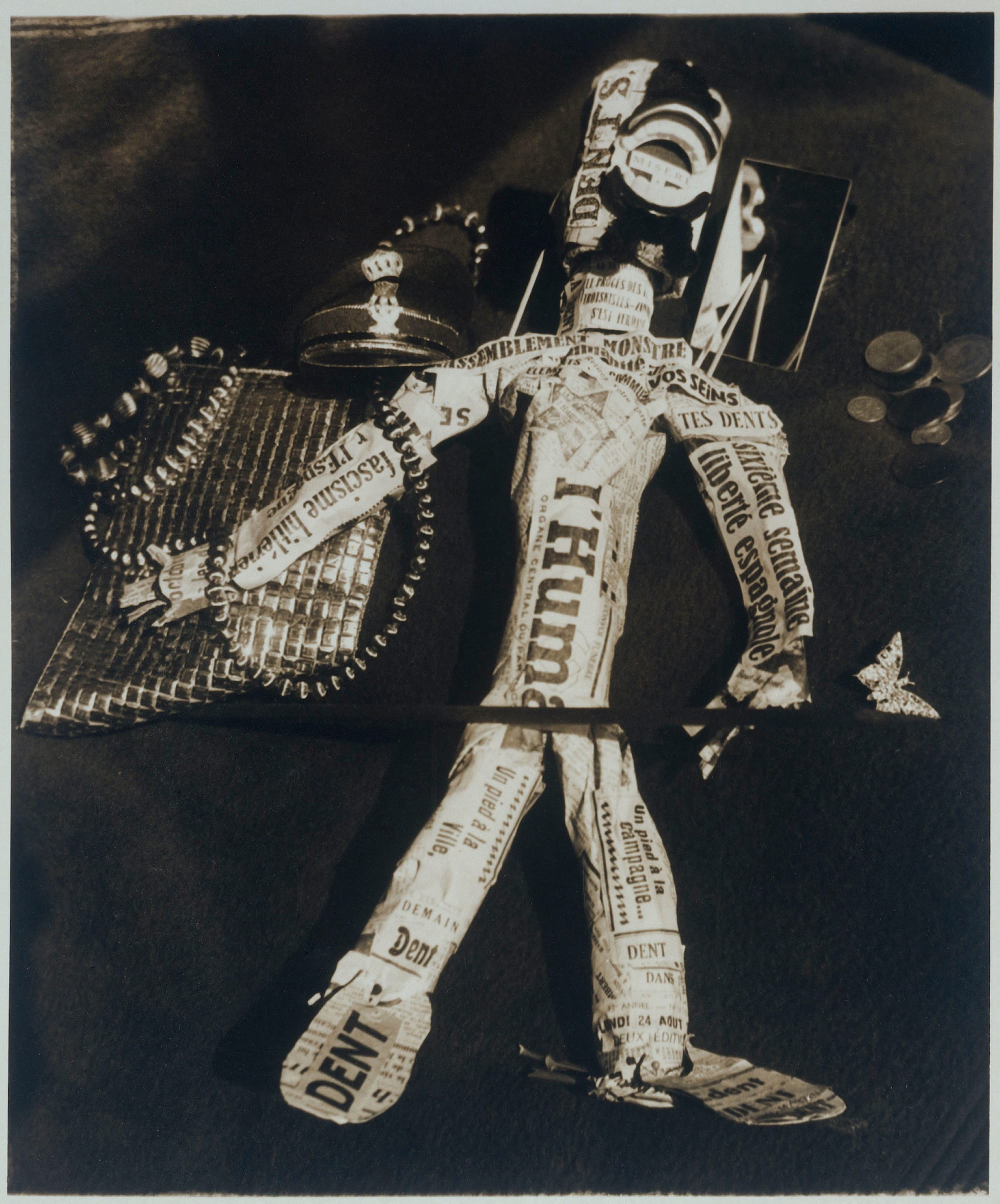 To underscore the theme of cross-national mobilization, the exhibition doesn’t center the artworks themselves — although plenty of paintings, drawings, films, and sculptures, most conveying stylistic and methodical affinities, are featured — as much as it employs them to trace artists’ lives, especially their prolific, politically engaged writing, and their wartime displacements. Copious art-political zines and pamphlets, such as the Surrealist Marxist journal Légitime défense, are presented in glass vitrines. Also included is antifascist agitprop by French artist Claude Cahun, who was sent, along with their partner, Marcel Moore, to a Nazi internment camp on the Channel Islands. One evocative photograph shows Cahun biting down on a pin in the shape of a swastika.
