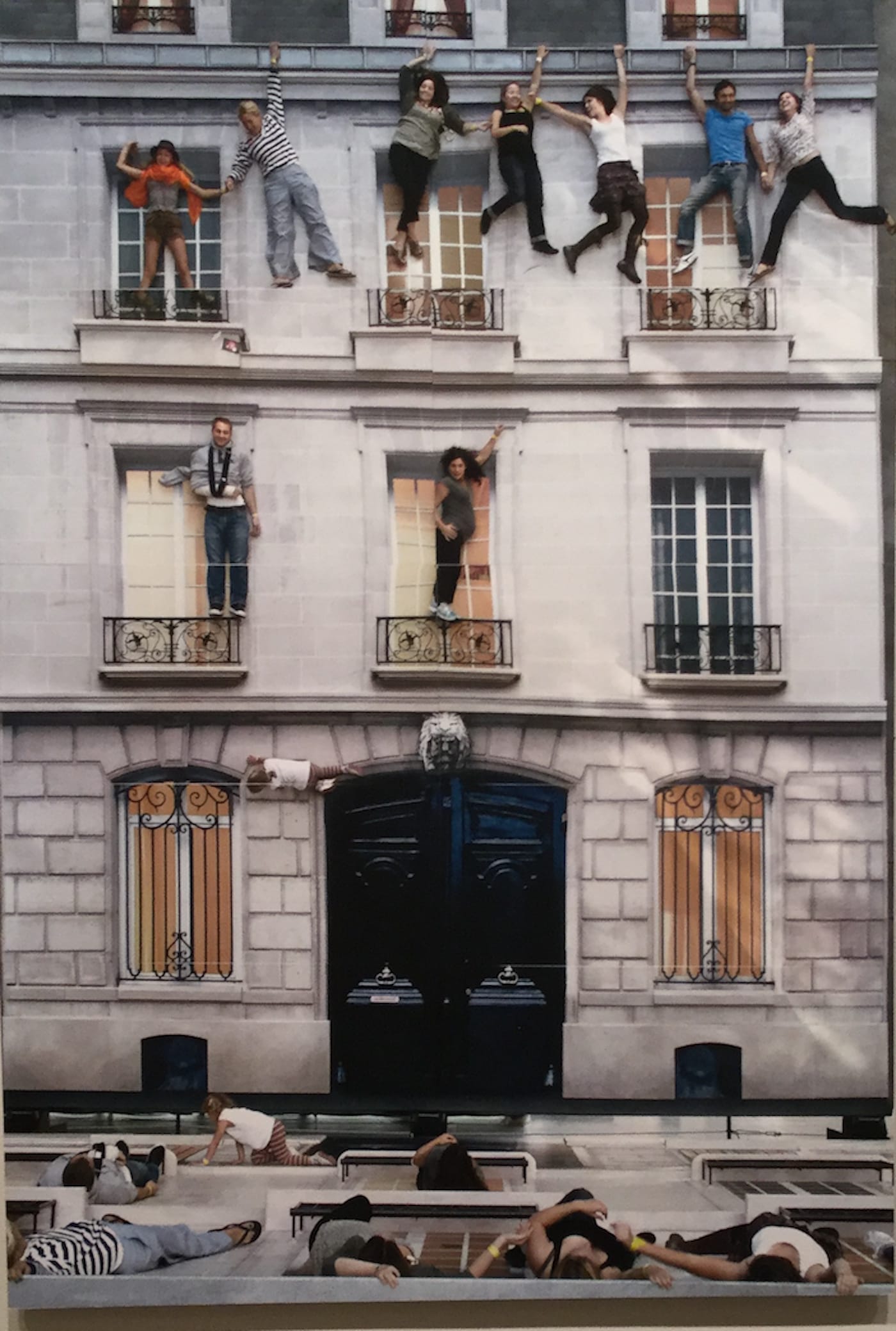 Because illusions are central to his work, encountering them in this exhibition through photographs makes assessing their full effect problematic, though some were easier than others. “Bâtiment II (Building II)” (2011), a popular idea Erlich repeated at several locations, is presented here as realized in Paris in 2011. Comprising a faux building façade lying on the ground under a massive mirror of the same dimensions suspended at 45 degrees, the illusion becomes that of a vertical façade festooned with people seemingly stuck to its surface. The magic is created by members of the public who simply lie on the façade below, and after the joke is absorbed, an attentive viewer is brought, for instance, to thoughts regarding the concept of a façade and how it masks a building’s purpose.
