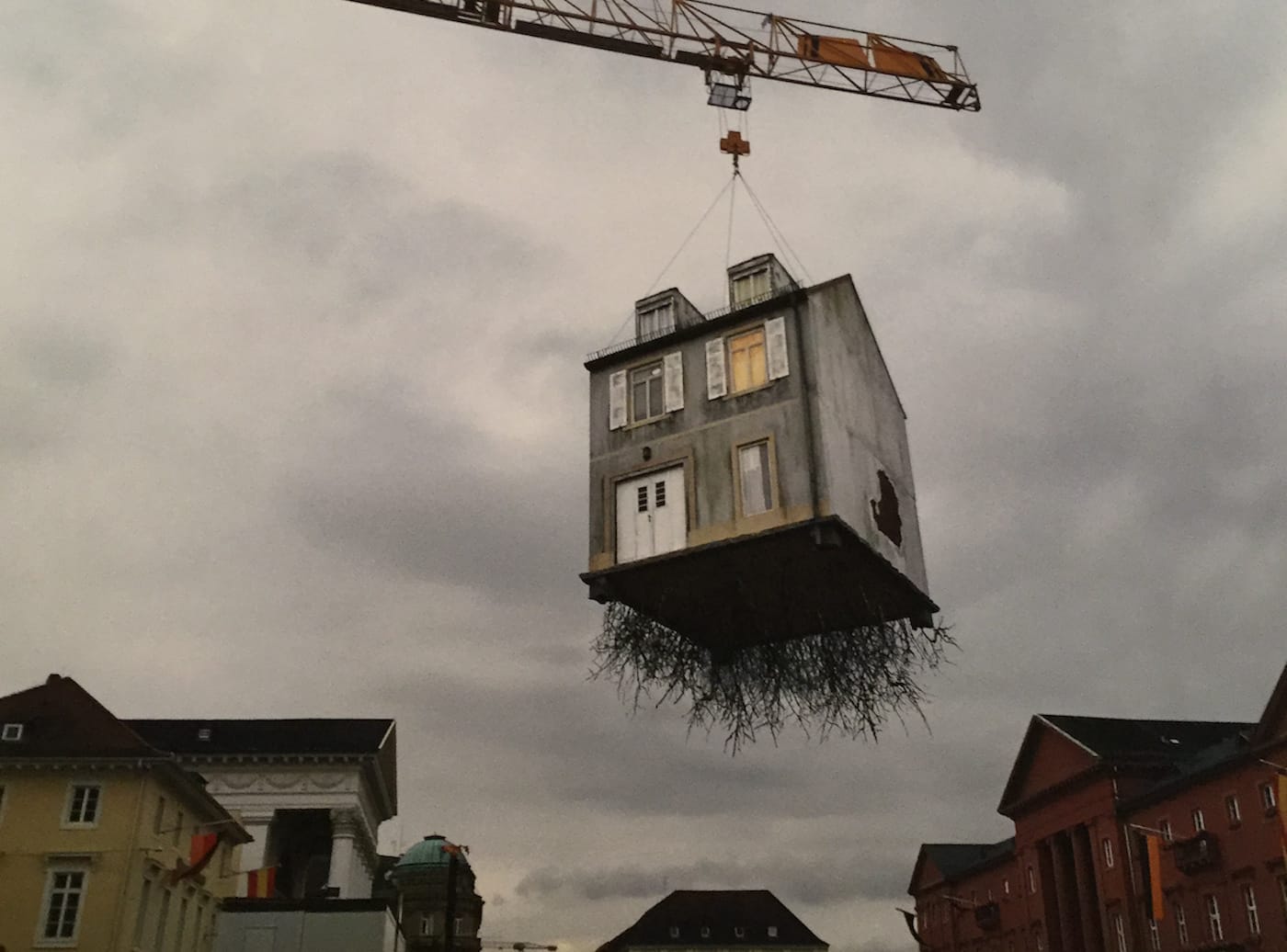 Most of Erlich’s projects are of the same apolitical variety. When he does choose to embrace politics, he steps lightly. “Pulled by the Roots I” (2015), a small house dangling from a crane above a town square, is a playful idea but also gently hints at the vulnerability of the uprooted, its simplicity amplifying the universality of being forcibly removed from anywhere. By addressing the archetype of home, political connotations are dispersed among viewers, not defanged.