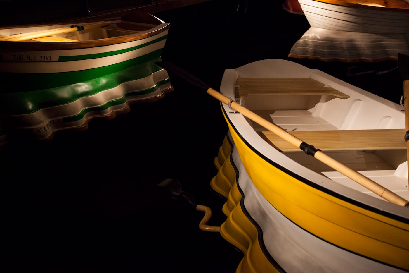Oddly enough, the installation that gives the exhibition its name, “Port of Reflections” (2016), offers the least persuasive illusion. A darkened space accessible along a surrounding wooden walkway harbors five unmanned rowboats that gently bob up and down on a dark surface. The upside-down undulated hulls below each boat are meant to read as reflections, and in a still photograph, they do just that. But onsite, their obvious sculptural solidity gives them away. And yet, a few SUNY students sharing the space with me when I visited seemed to delight in the sheer audacity of the installation itself, which succeeds as a whole by suggesting that the darkness in fact hides a substantial body of water.