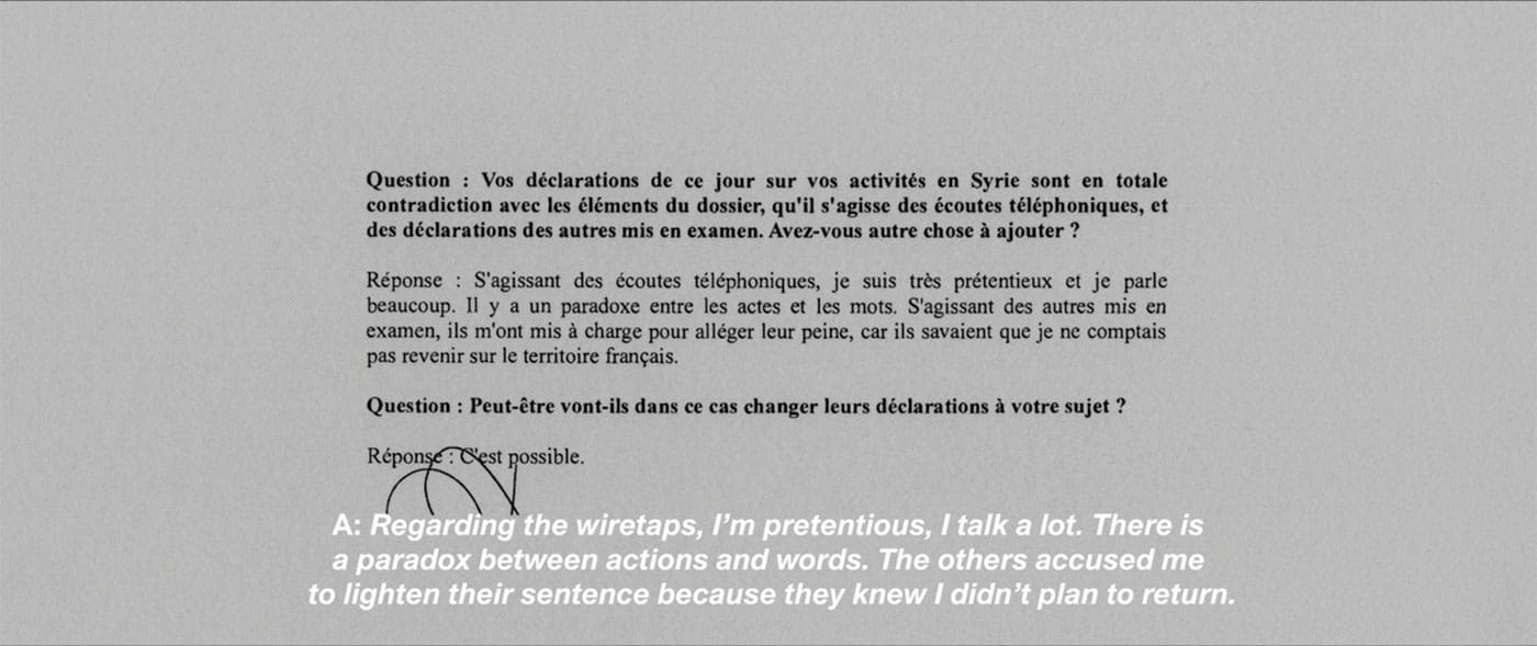 In Also Known As Jihadi, Baudelaire uses raw footage of the places Abdel “Aziz” Mekki (a pseudonym for the protagonist) has lived in and traveled to. But, unlike its Japanese precursor, the film doesn’t employ narration; instead, Baudelaire inserts shots of judicial documents before or after cinematic movements, creating a quiet and haunting mystery. The film opens with an image of a psychological evaluation that reads: “the subject self exiled in Egypt, Turkey, and Syria, with motives that seem confused, indecisive, and often contradictory.” It goes from the suburbs of Paris where Aziz grew up to the school he attended, then the Turkish region of Antakya, which borders Syria, all the way to Spain, and, finally, to the Paris court house where he was judged.