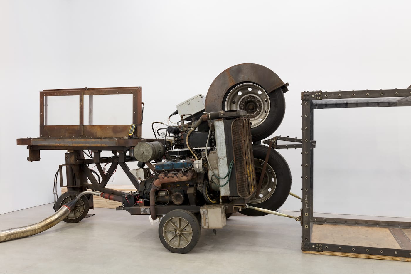 The centerpiece of the Marlborough show is the self-contained and very dangerous “Pitching Machine.” It’s powered by a 500 cubic-inch Cadillac engine, and only does one thing: it shoots two-by-four boards at 200 miles per hour into a chamber so the force and speed makes the boards explode. It’s kind of hard to describe, but think of a giant wood chipper powered by a car engine and it’s kind of like that.