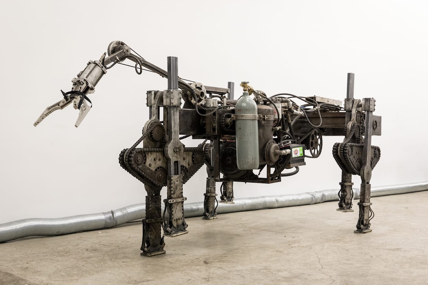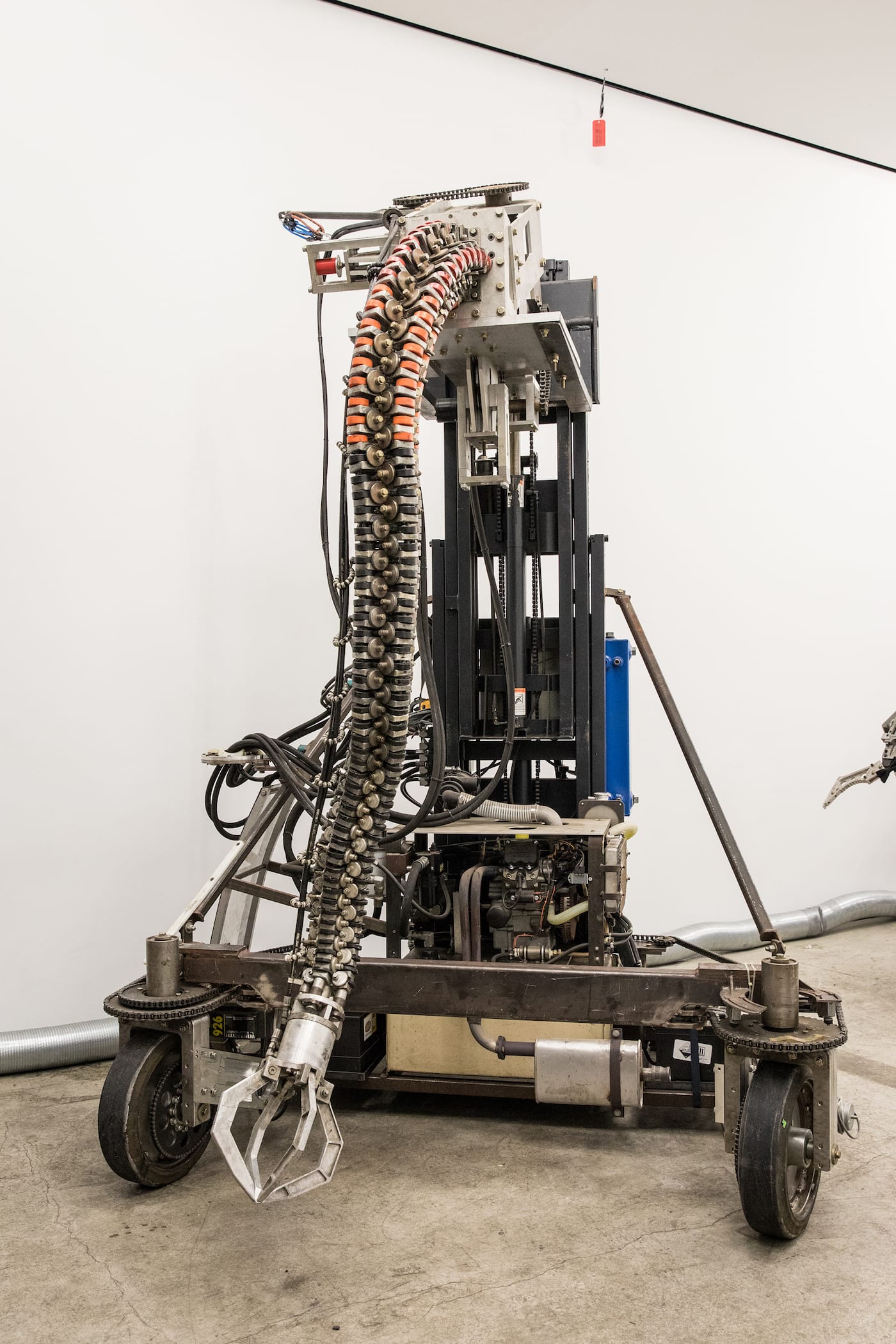 Other robots on display include the fully functioning “Spine Robot” (2012–2014), a rolling, radio-controlled metal chassis that supports an evil-looking snake-like arm with a claw at the end, resembling one appendage of Dr. Octopus.
