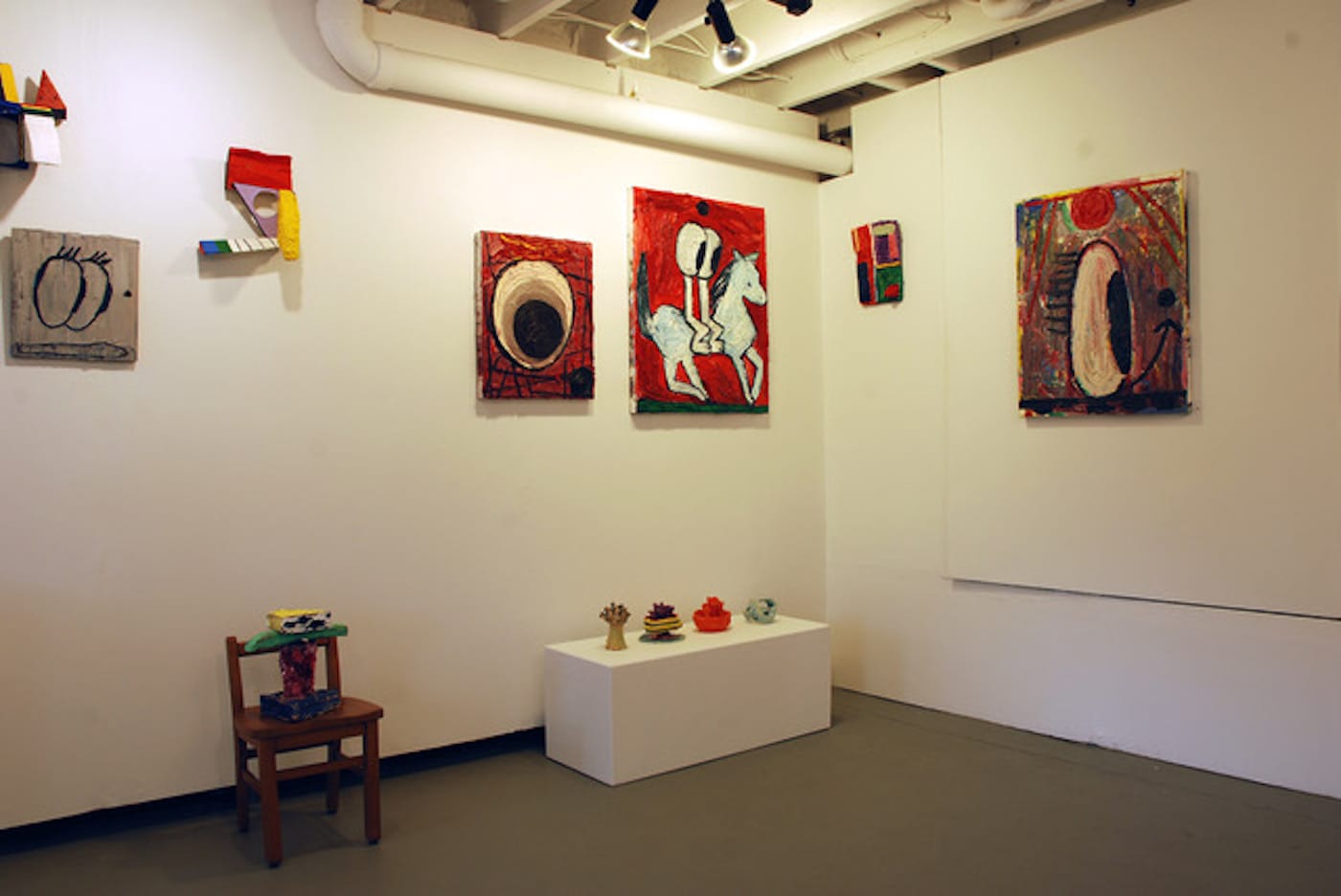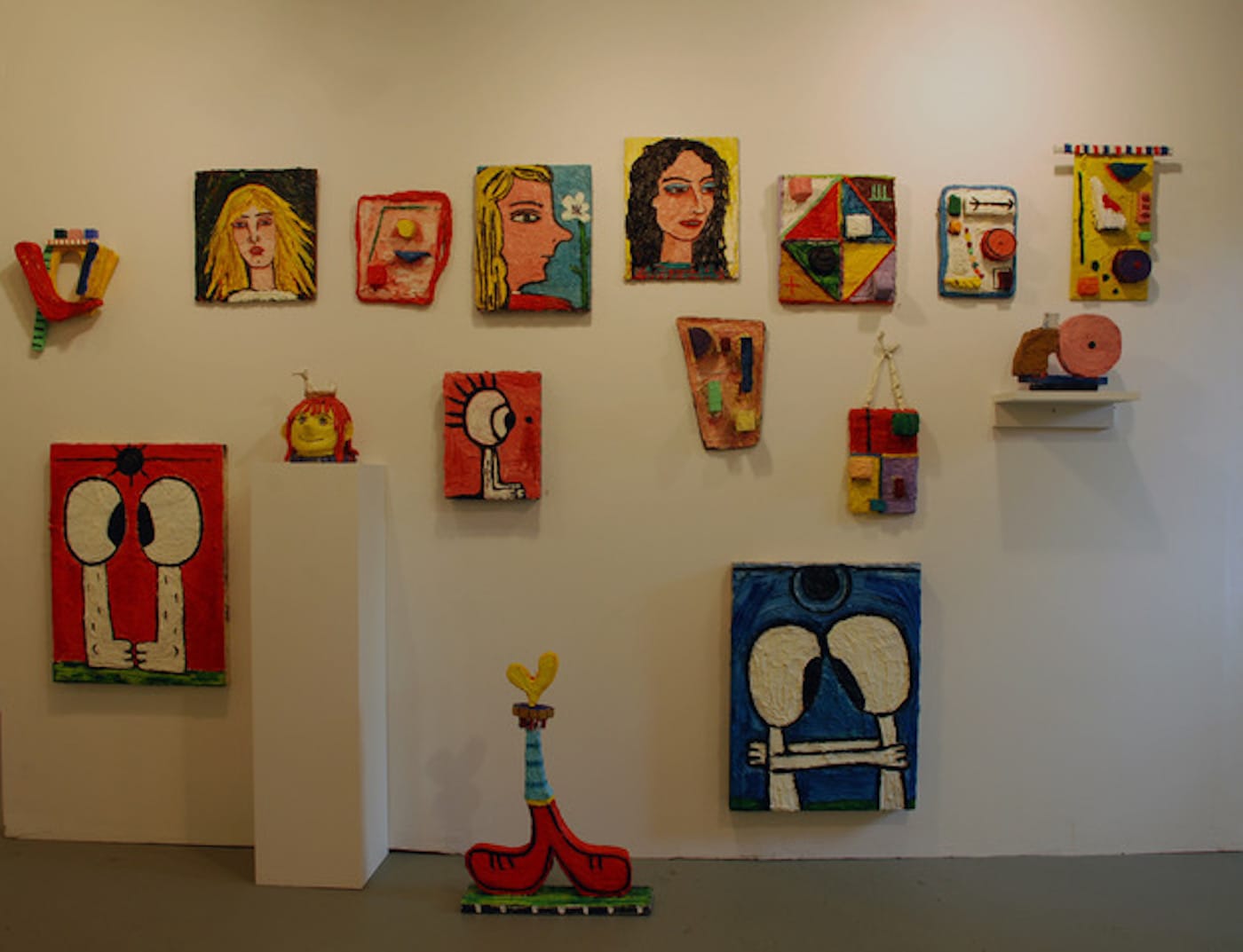 HILLSIDE, New York — When you first enter Susan Carr’s solo exhibition, FLIPSIDE, on view at LABSpace, the 75 featured paintings and sculptures appear whimsical and carnivalesque; they’re heavy on primary colors and rendered in a childlike, faux-naif style. The longer you look, however, the more you realize this is not a carnival, but a multi-faceted document of Carr’s determination to make artwork by any means necessary despite decades of financial struggles after she became a single mother at age 16. What initially appears playful grows frightening upon closer inspection: the delirious smiles of her paintings’ subjects read as comments on how often average women are expected to “grin and bear it” after surviving trauma.