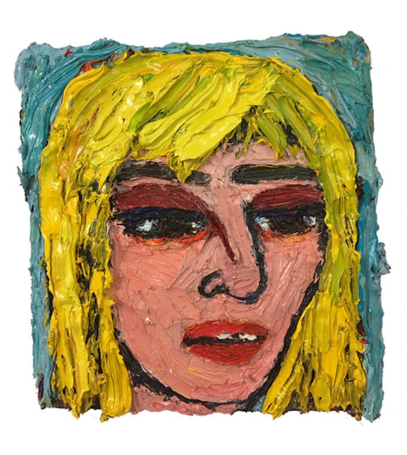 In a portrait of the artist’s grandmother, Peg, who hailed from Appalachia and suffered through an unhappy marriage, a flat pink face with a half-open mouth and bright yellow brush strokes for hair bursts out from a creamy, light-blue background. Black eyes rimmed in red with lids half-shut evoke a sense that the subject is holding back tears.