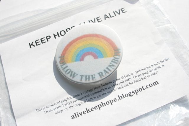 Artist Suzanne Broughel's "Keep Hope Alive Alive" project takes vintage designs from past Black presidential candidates (Jesse Jackson and Shirley Chisholm mostly) and altered them to remove the candidate's name and image leaving the generic imagery of "hope," "change," and the other clichés of the