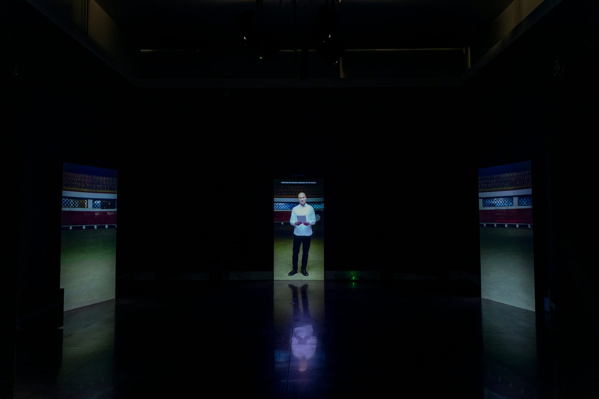 In later projects about abuse of women, Lacy moves off screen, and draws clearer ethical lines. Two major projects address domestic violence, which firmly shifts the conversation about sexual assault away from the casting rooms and college dorms that initially headlined the "Me Too" movement. The harrowing De tu puño y letra (By your own hand), originally a four-act event staged in Quito, Ecuador, in 2015, following a year-long process of research and discussion, is represented in Queens by an unforgettable 30-minute, five-channel video from 2018. Projected on tall, narrow screens arranged in a circle, echoing the bull ring of the original event, are men of every age — and some boys — who appear one by one and solemnly read aloud letters written by women about their experiences of intimate violence. The testimony is often brutal and always heartbreaking, although the final readings focus on women who have successfully left their abusive partners. The last text, read twice, includes the phrases, “The memory is flesh it is in my body. It is what I am” and “It doesn’t matter who receives this letter, it is necessary to share the pain with others.” These readings are followed by a choral recitation and a candlelit procession. Light shines.