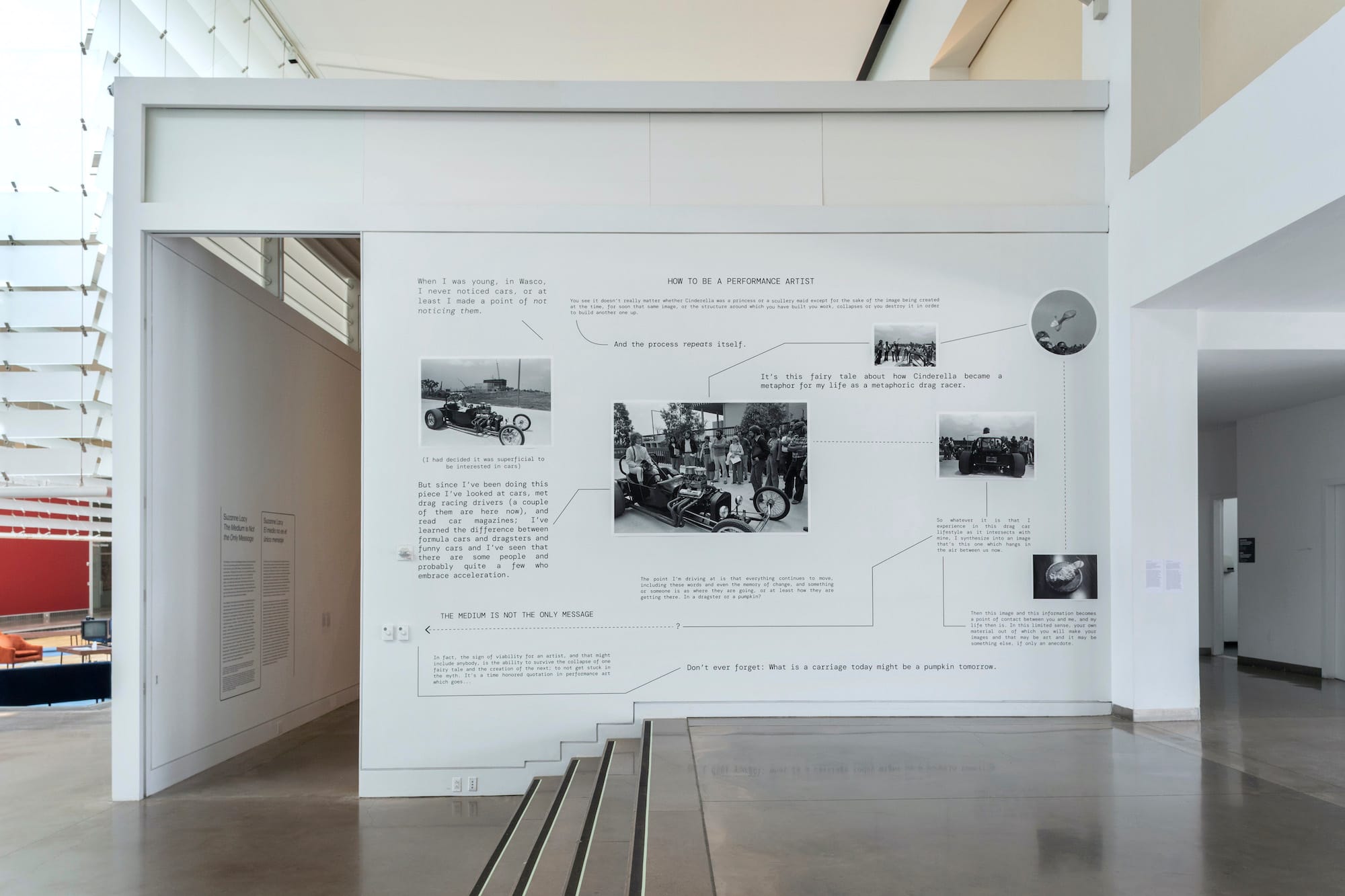 One of the earliest works in the show is its most autobiographical: In Cinderella in a Dragster (1976/22), a staged monologue here presented as an audio recording, Lacy talks about being constantly on the move, says the process is more important than the image (a claim she later challenged, for instance in this show’s title), and compares performance to fairy tales, inasmuch as everything relates, and has meaning. But an introductory wall text, laid out as a scrambled flowchart, ends with an excerpt from Cinderella that warns, “Don’t ever forget: what is a carriage today might be a pumpkin tomorrow.” It behooves an activist artist to know herself, what she’s up against, and when to hand over the mic.