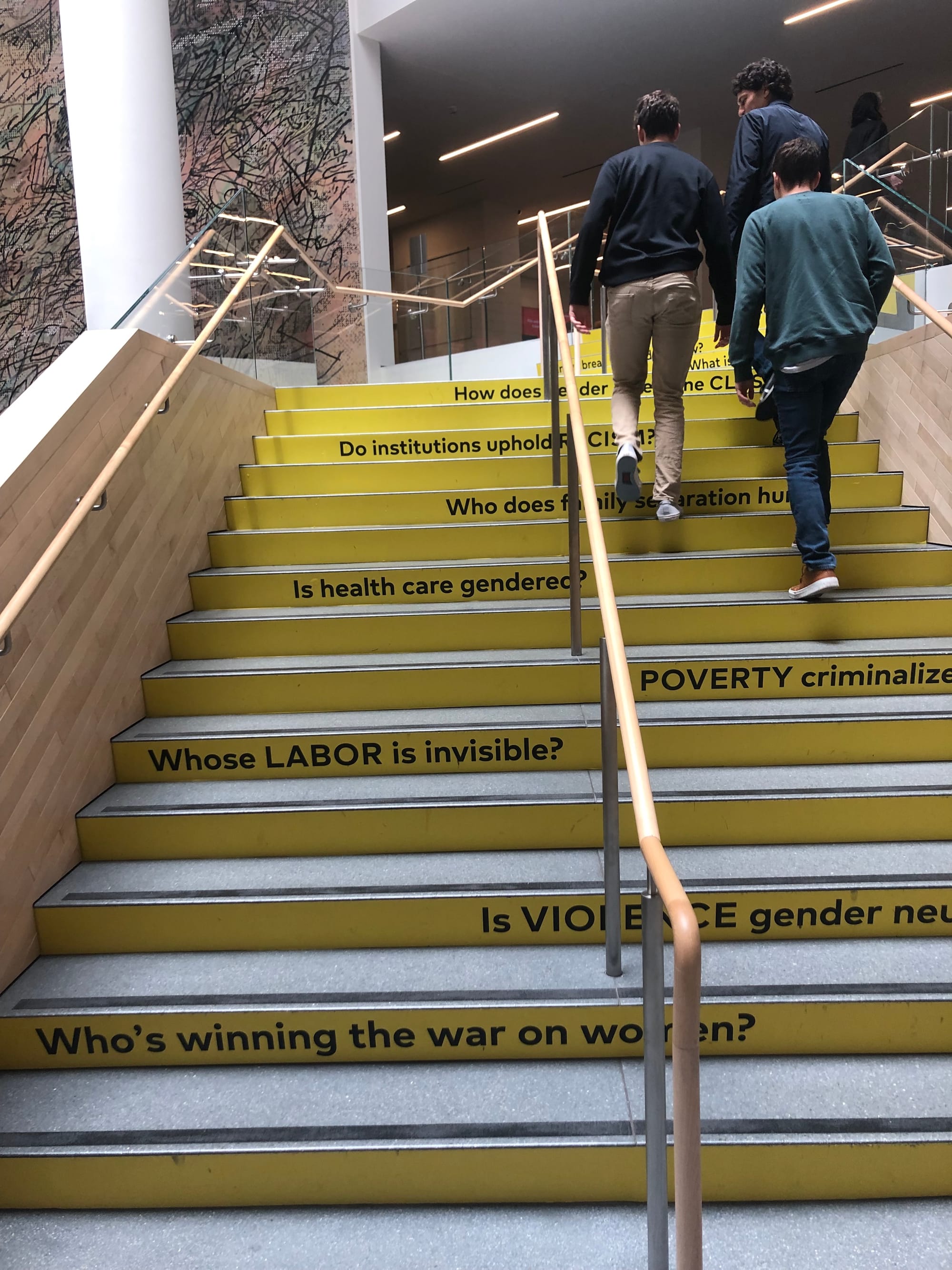 Lacy’s themes are spelled out before you even get to the seventh floor at SFMOMA. The stairs from the ground floor to the exhibition spaces bear messages in black letters on yellow: Who’s winning the war on women? Is VIOLENCE gender neutral? Whose LABOR is invisible? Lacy similarly lined the front steps of the Brooklyn Museum in 2013.