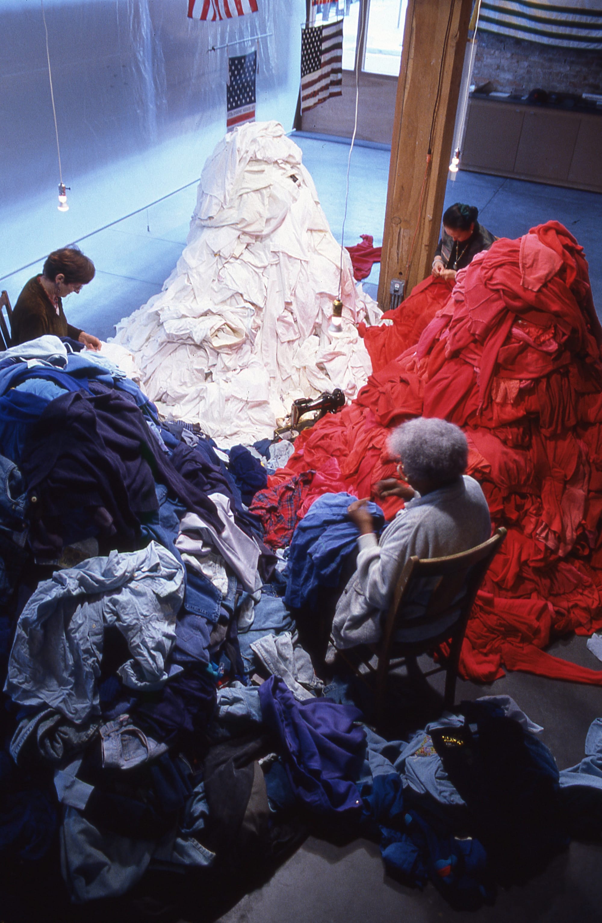 Lacy’s Alterations, originally done in 1994–95 and reactivated now at SFMOMA, likewise reflects multiple social issues — women’s work, immigration, patriotism, capitalism — while nodding to conventional depictions of women in art. In Lacy’s piece, women hand-stitch fabric from towering piles of red, white, and blue cloth that are replenished every evening, creating an endless stream of work that calls attention to San Francisco’s own garment district, where mostly female immigrant labor sews to feed America’s consumer maw, and to feed their families. Sewing is a double bind for women in art, signifying both virtuous women’s work and sex (the old in and out).