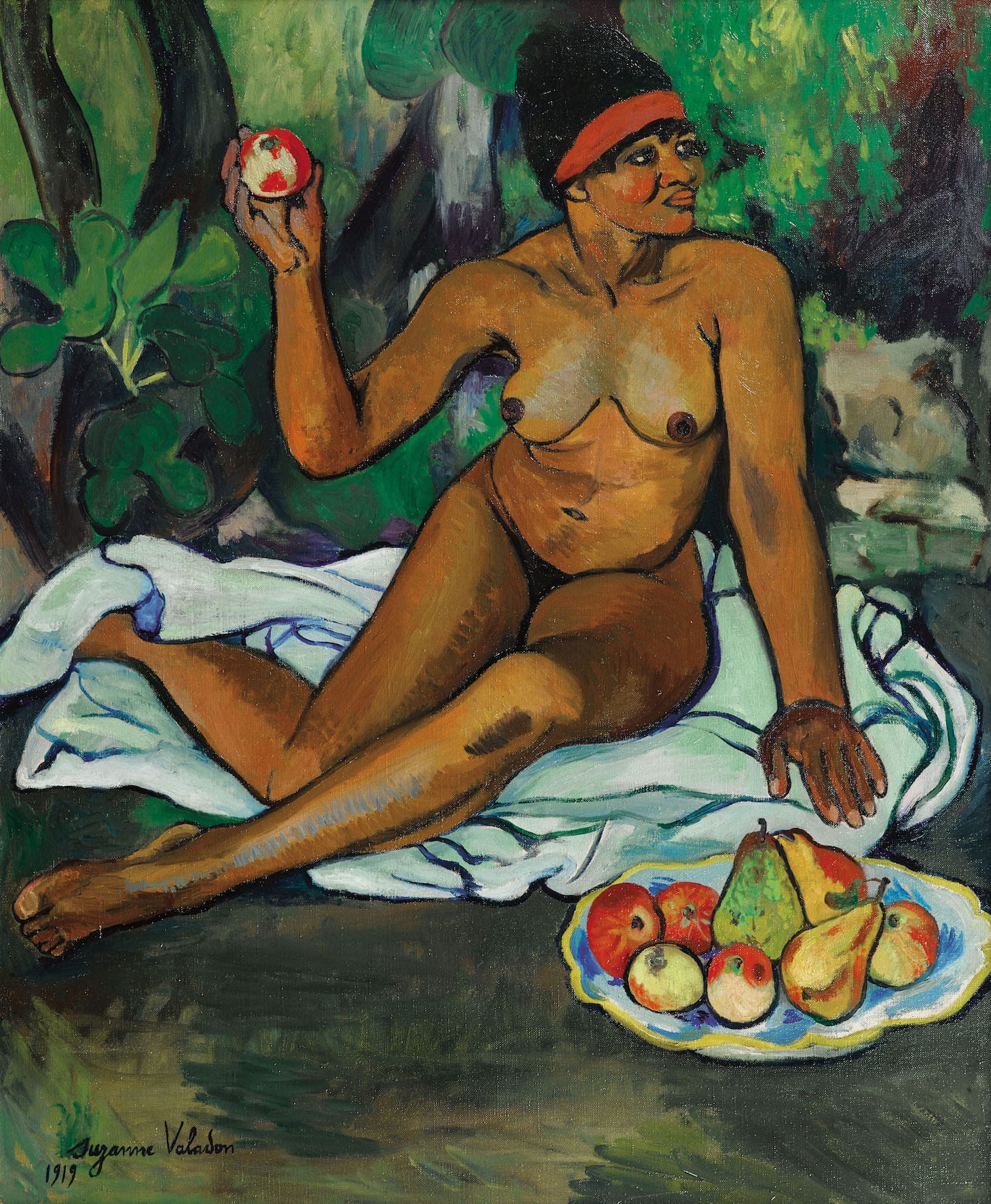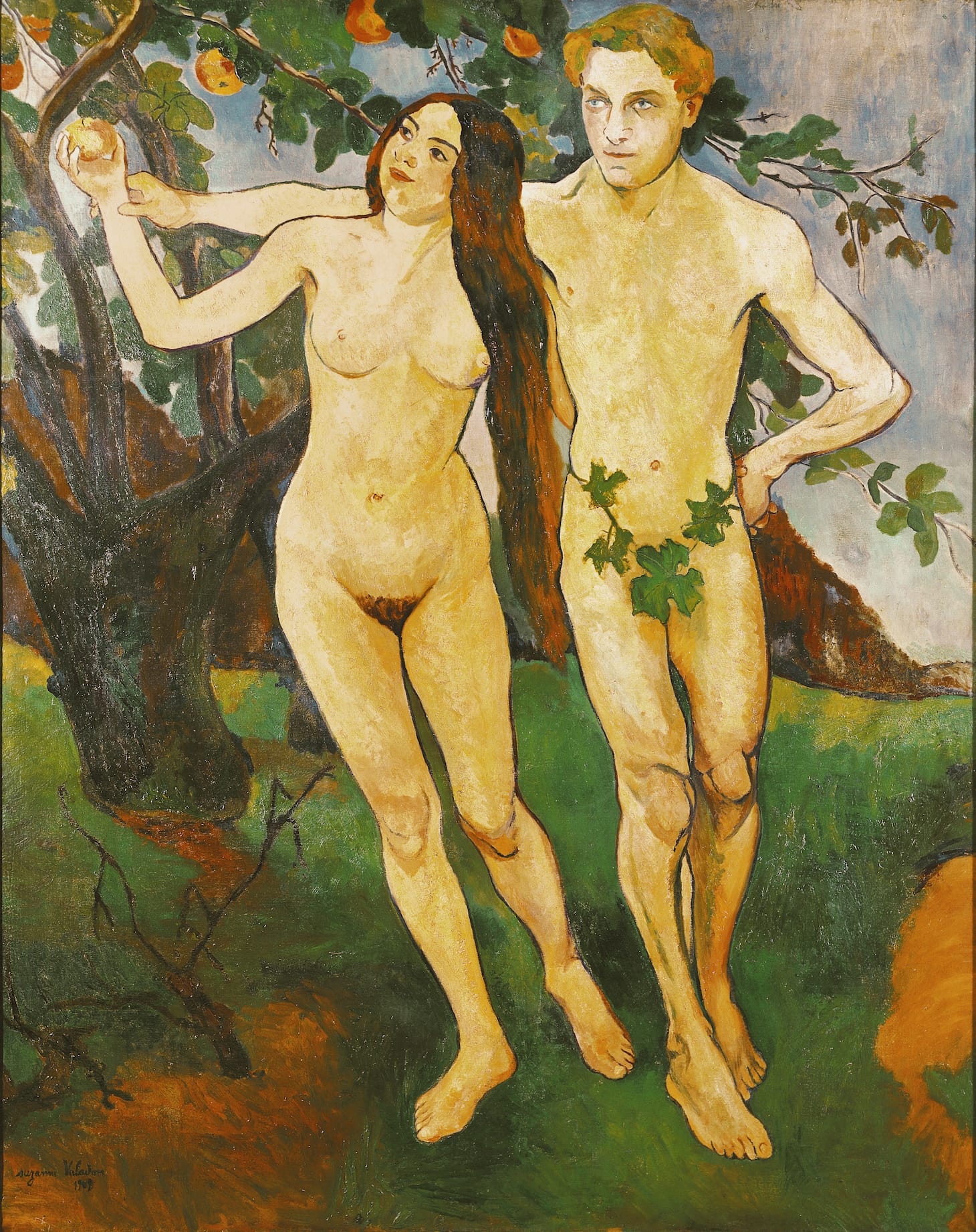 After divorcing Mousis, Valadon had to make a living from her art and began painting exclusively in oils, mostly nudes because she could earn the most for them. A 1909 portrait depicts herself and Utter as Adam and Eve, she inviting him to taste the apple. Most viewers saw the biblical couple, according to the exhibition catalogue, and not the 44-year-old artist seducing her 23-year-old lover. For a woman to paint a male nude at the time was unheard of. She later added fig leaves so the painting would be allowed into an exhibition.