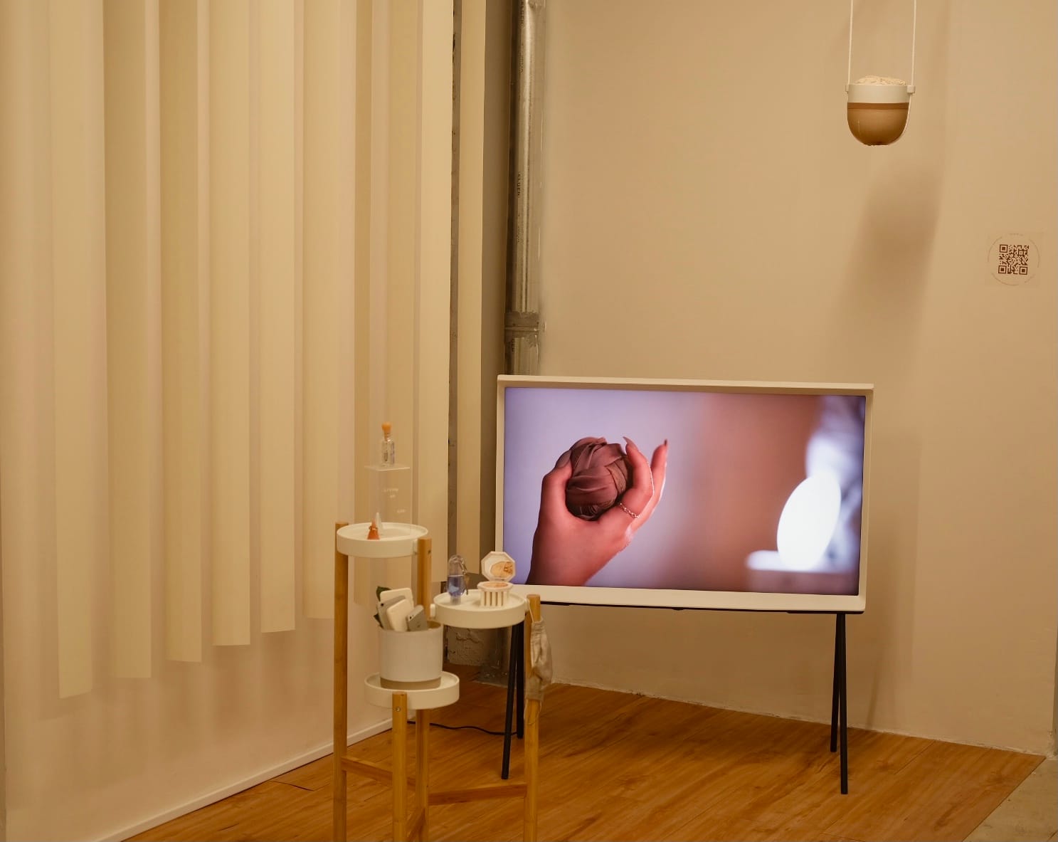 In “Living on Lite,” Alyssa Freitas curates an insular, padded room of secluded self-reflection. A tiny flash drive in a jar appears on a pedestal and in a video installation promoting a diary app designed by the artist. On the wall, a QR code ingeniously leads to a video walkthrough. The distinctions between reality and advertising feel blurry here, hinting at the innovative yet toxic roles of tech and social media.