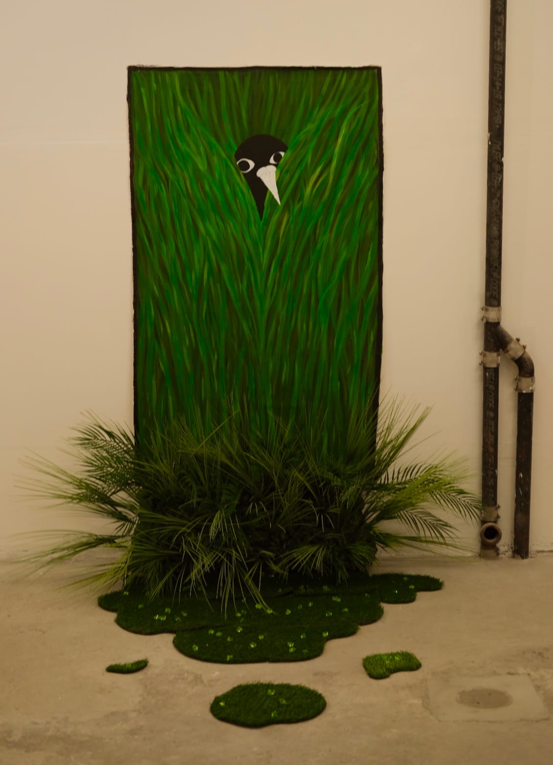 A friendly blackbird peeks from between blades of tall grass in Dan Xie’s playful mixed media piece, “Hiding in the Grass for a Peace.” Nearby, another work shows this same bird peering through a windowsill, its gaze piercing through a batch of fake flowers over the pane. Xie made friends with the birds outside her window throughout the last year, and these works speak to the poetic humility found in nature.