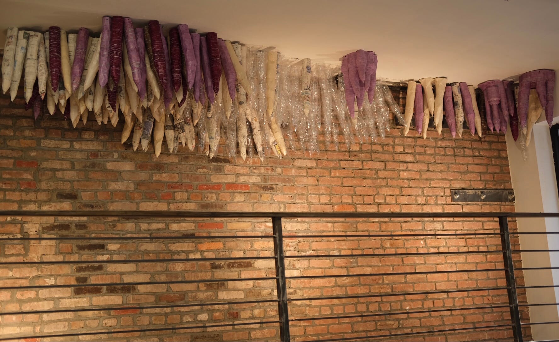 A set of plush and plastic stalactites hangs from the ceiling in a mixed media sculpture by Kristian Battell. The artist gathered a month’s worth of plastic water bottles from one family member, inserting them between colorful cones of stuffed newspaper. Titled “Anthropocene Cavern,” the work calls attention to the built world forming from human waste and the gradual erosion of geological formations.