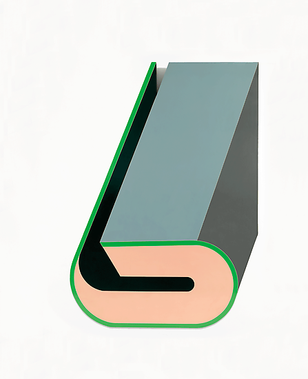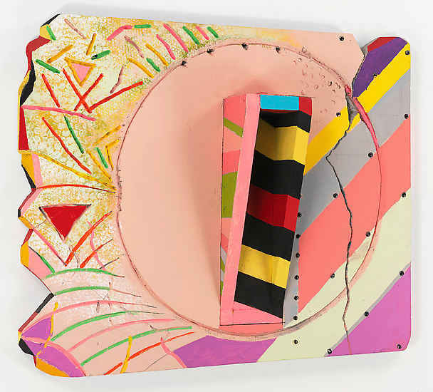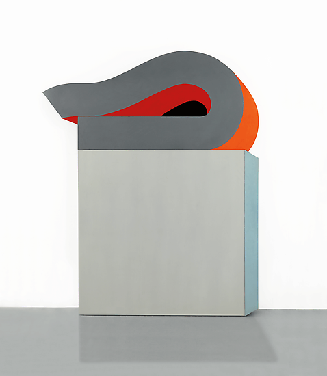 In “Disneyesque” (1970 – 71), a supposedly three-dimensional form — a perspectivally painted gray, red, and orange D that seems to be crumpling under its own weight–rests on a large, gray two-dimensional base.